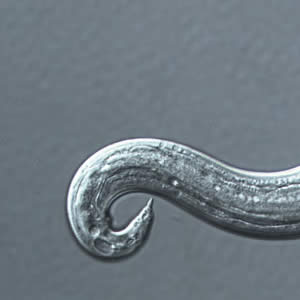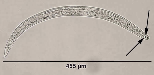A researcher was studying parasites of public health concern found in snails and slugs. A small portion of one specimen had tissue removed and placed in a small dish with a HCl/pepsin solution. Many larvae were observed in the dish, however most were dead or dying, but a few larvae were active. Figure A shows one of the active larvae in at wet mount captured at 200× magnification. Figure B shows a larva under differential interference contrast (DIC) microscopy at 400× magnification. What is your identification of the objects? Based on what criteria?