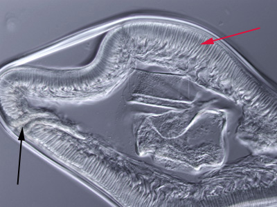 A small worm approximately 2.5 cm in length was recovered from the stomach of a 38-year-old male. The anterior end had been damaged by the extraction but it was sent to the CDC to see if it could still be identified. It was placed in lacto-phenol for clearing, after which it was still difficult to make a definitive identification. A small cross-section was made and examined using a compound microscope. The specimen in Figure A was captured at 40x magnification using brightfield illumination; the specimen in Figure B at 200x using differential interference contrast (DIC) microscopy. What is your diagnosis? Based on what criteria?