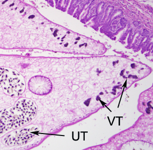 A 47-year-old man, originally from Thailand, presented to the hospital with upper abdominal pain accompanied with liver enlargement. A biopsy of the bile duct revealed fibrotic thickening. The biopsy specimen was sent to Pathology for routine sectioning and staining. Figures A–F show what was observed by the attending pathologist on slides stained with hematoxylin-and-eosin (H&E). Figures A and B were taken at 100x magnification. Figures C and D were taken at 400x magnification. Figures E and F were taken at 1000x magnification with oil. What is your diagnosis? Based on what criteria?