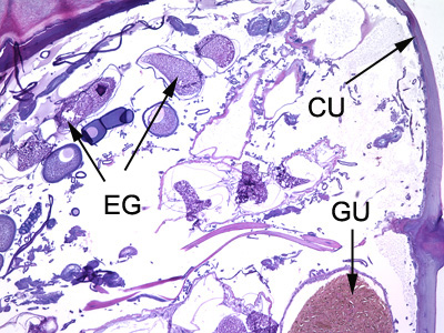 . Females do not have any specialized burrowing organs, and simply claw into the epidermis after attaching with their mouthparts. After penetrating the stratum corneum, they burrow into the stratum granulosum, with only their posterior ends exposed to the environment