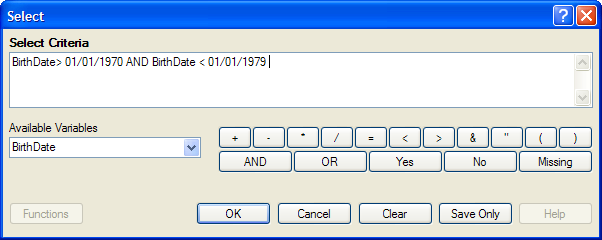 - Use the Select Criteria field and the Functions and Operators buttons to create selection code.