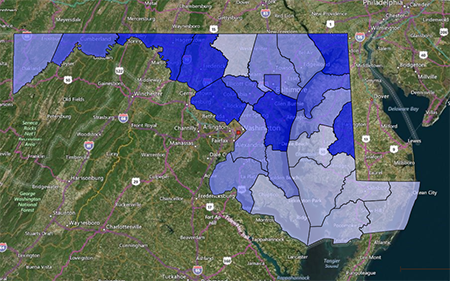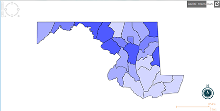 - The choropleth map appears, showing the number of records in the dataset within each Maryland County. Counties with the highest tier of records are dark blue, while counties with the least amount of records are very light blue. Note that the “starting” data category is white, but no data fall into that particular category here.