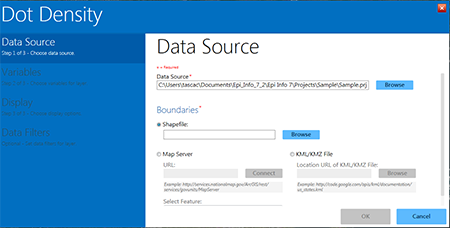 Epi Map can create a choropleth or dot density map by combining a dataset with three boundary formats: shapefile, map server, or KML (Keyhole Markup Language) (descriptions of each format follow). This is the map/boundary format compatibility: