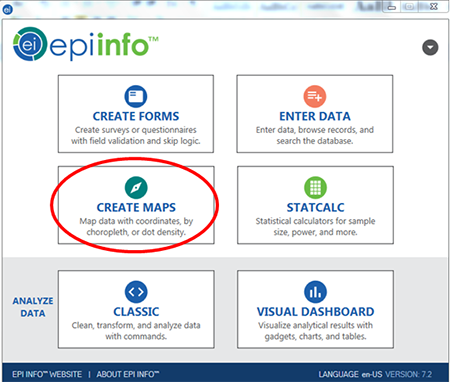 Figure 10.1: Epi Info 7™ main menu, highlighting Create Maps menu option