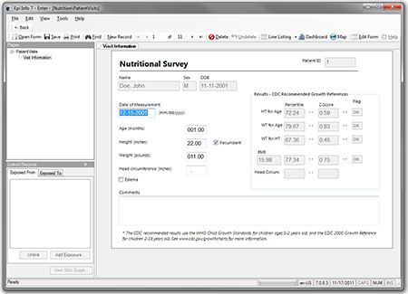 The patient’s name, sex, date of birth, and ID number automatically appear in the form. These values link the records in this form to the child’s nutritional record in the Nutrition form. As you type values into the PatientVisits form (e.g., date of measurement, age in months, height, weight, etc.) the z-scores and percentiles are automatically calculated and appear in the form.