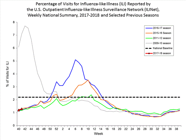 * Effective October 3, 2021 (week 40), the ILI definition (fever plus cough or sore throat) no longer includes “without a known cause other than influenza.”