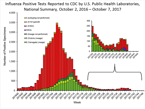 The results of tests performed by clinical laboratories nationwide are summarized below. Data from clinical laboratories (the percentage of specimens tested that are positive for influenza) are used to monitor whether influenza activity is increasing or decreasing.