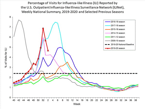 Note: The COVID-19 pandemic is affecting healthcare seeking behavior. The number of persons and their reasons for seeking care in the outpatient and ED settings is changing. These changes impact data from ILINet in ways that are difficult to differentiate from changes in illness levels, therefore ILINet data should be interpreted with caution. CDC is tracking the COVID-19 pandemic in a weekly publication called COVIDView.