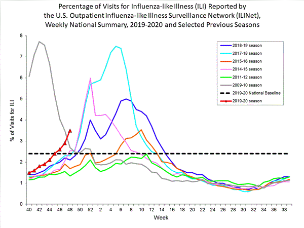 Nationwide during Week 48, 4.0% of patient visits reported through ILINet were due to respiratory illness that included fever plus a cough or sore throat, also referred to as ILI. This has remained stable compared to Week 47 and is above the national baseline of 2.9% for the fifth consecutive week. ILI activity increased in regions 1, 3, 5, and 9, decreased slightly in Region 6, and remained stable but trending upward in all other regions (regions 2, 4, 7, 8, and 10) during Week 48 compared to Week 47. All regions are at or above their region-specific baselines this week. Multiple respiratory viruses are co-circulating, and the relative contribution of influenza virus infection to ILI varies by location.