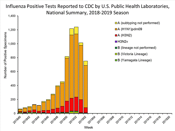 Nationally influenza B/Victoria viruses have been reported more frequently than other influenza viruses this season. However, during recent weeks, influenza A(H1N1)pdm09 viruses have been reported more frequently than B/Victoria viruses. The predominant virus varies by region. Regional and state level data about circulating influenza viruses can be found on FluView Interactive.