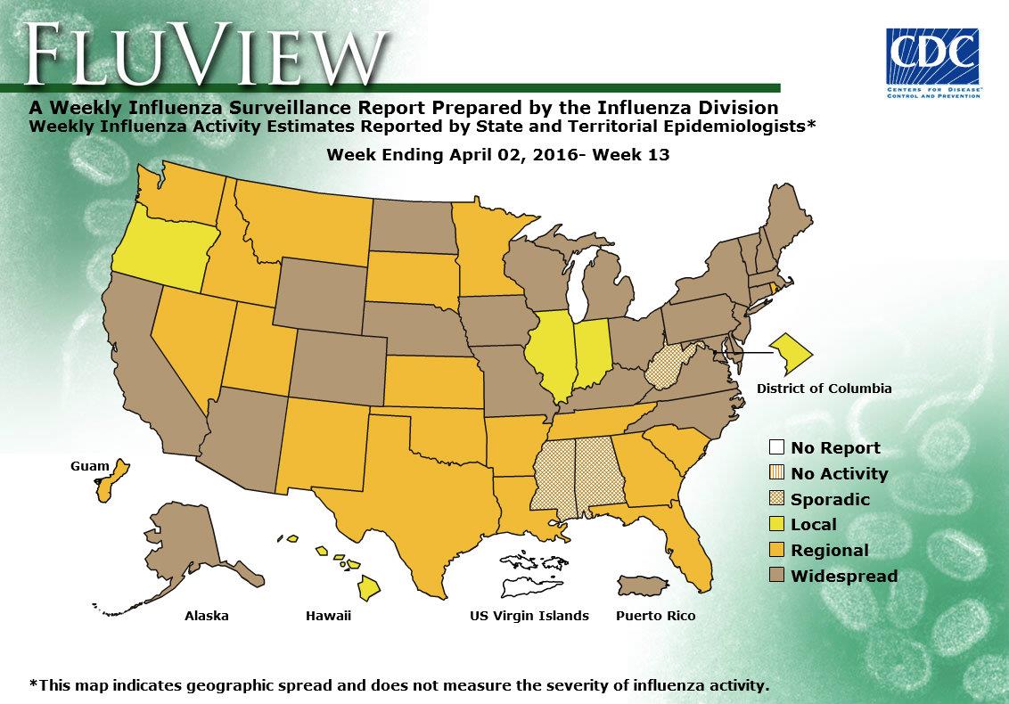 During week 13 (March 27-Aprl 2, 2016), influenza activity decreased slightly, but remained elevated in the United States.
