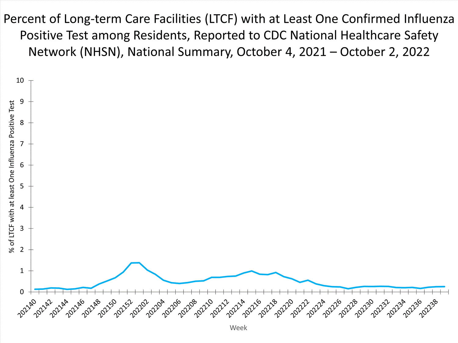 LTCFs (e.g., nursing homes/skilled nursing, long-term care for the developmentally disabled, and assisted living facilities) from all 50 states and U.S. territories report data on influenza virus infections among residents through the National Healthcare Safety Network (NHSN) Long-term Care Facility Component. During week 39, 36 (0.3%) of 14,367 reporting LTCFs reported at least one influenza positive test among their residents.