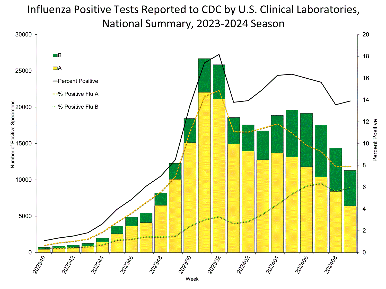 The results of tests performed by clinical laboratories nationwide are summarized below. Data from clinical laboratories (the percentage of specimens tested that are positive for influenza virus) are used to monitor whether influenza activity is increasing or decreasing.