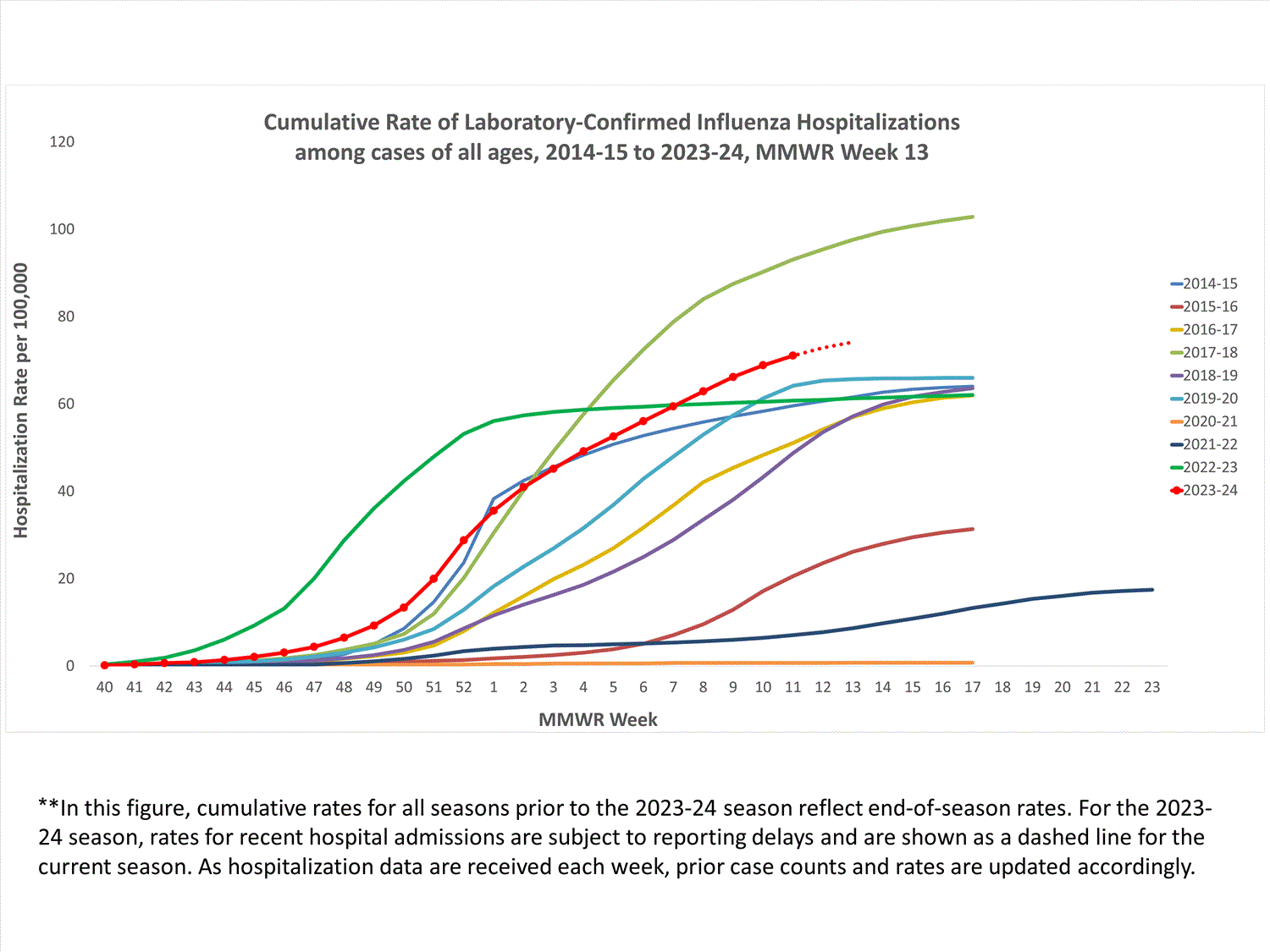 In these figures, cumulative and weekly rates for all seasons prior to the 2023-2024 season reflect end-of-season rates. For the 2023-2024 season, rates for recent hospitals admissions are subject to reporting delays. As hospitalization data are reviewed each week, prior case counts and rates are updated accordingly.