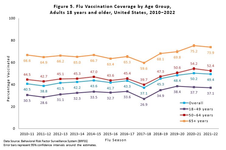 Overall, among adults ≥18 years, flu vaccination coverage was 49.4%, 0.8 percentage points lower than coverage during the 2020–21 season (50.2%; Figure 5) and 1.0 percentage points higher than during the 2019-20 season (48.4%).