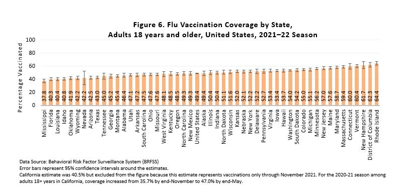 There was wide between-state variability in flu vaccination coverage among adults, ranging from 37.8% in Mississippi to 64.4% in Rhode Island (Figure 6). See the interactive FluVaxView application for additional state-level estimates by age-groups and multiple flu seasons.