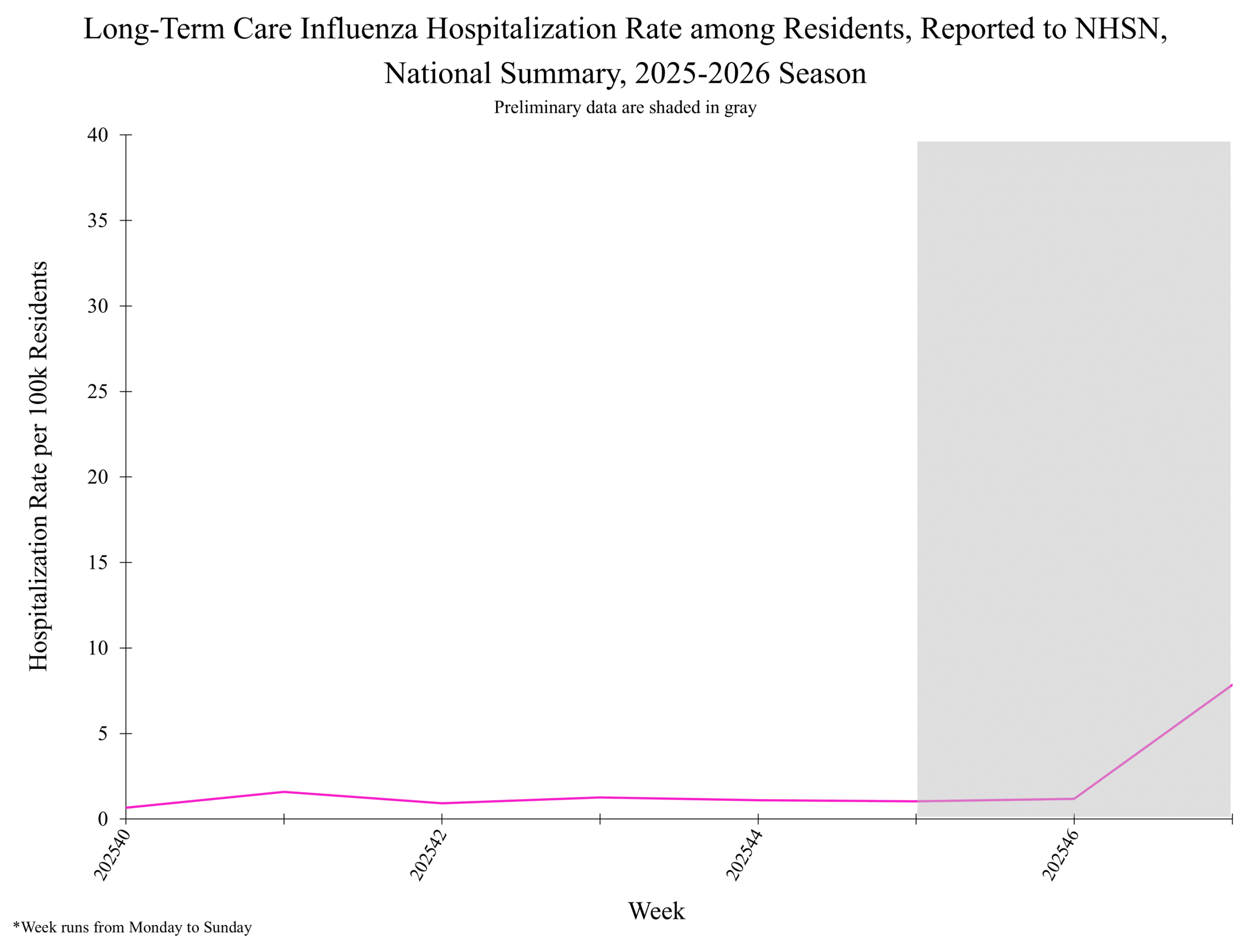 NHSN Long- Term Care (LTC): Up or down arrows indicate change of greater than or equal to 5% in hospitalization rates for residents in LTC facilities who were hospitalized with laboratory-confirmed influenza compared to the previous week.