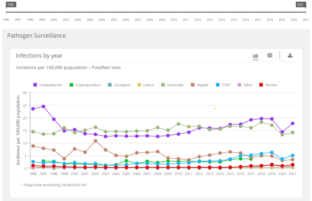 FoodNet sets a reference period that can be used for many years. FoodNet used 1996–1998 and 2006–2008 as reference periods in earlier reports. The current reference period matches the reference period used for the Healthy People 2030 goals for Campylobacter, Listeria, Salmonella, and STEC.