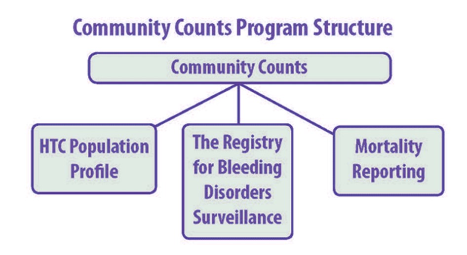 Community Counts is a public health monitoring program funded by CDC's Division of Blood Disorders and Public Health Genomics (DBDPHG). The purpose of this project is to gather and share information about common health issues, medical complications, and causes of death that affect people with bleeding disorders cared for in US hemophilia treatment centers (HTCs). Community Counts aims to continue the work of the Universal Data Collection System, which ended in 2011.