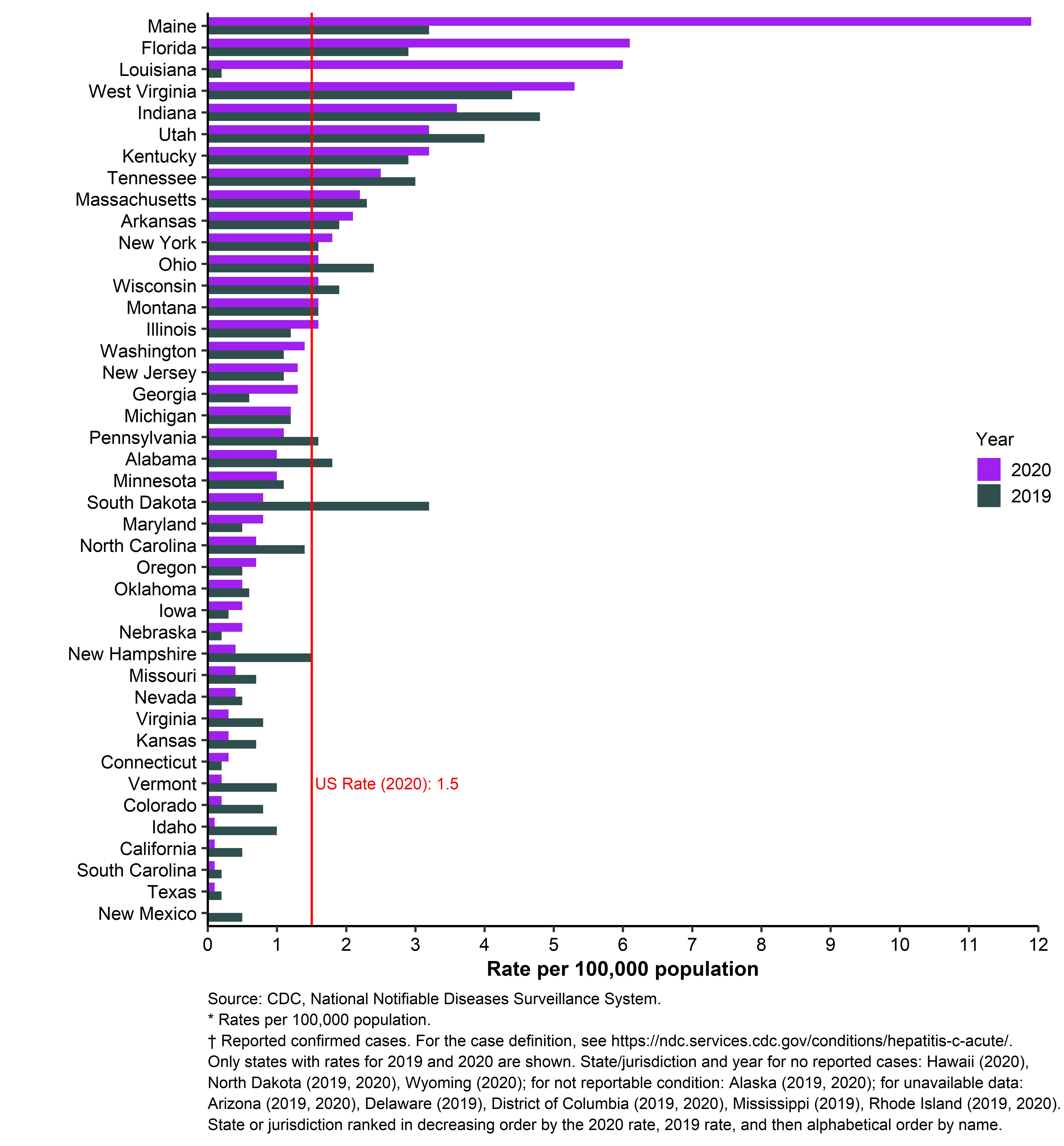 During 2020, the rates of reported acute hepatitis C ranged from a high of 11.9 cases per 100,000 population in Maine to a low of ≤0.1 cases per 100,000 population in California, Idaho, New Mexico, South Carolina, and Texas. The largest absolute increase in rates was observed in Maine, with a rate during 2020 (11.6 cases per 100,000 population) more than 3 times the rate reported during 2019 (3.2 cases per 100,000 population).