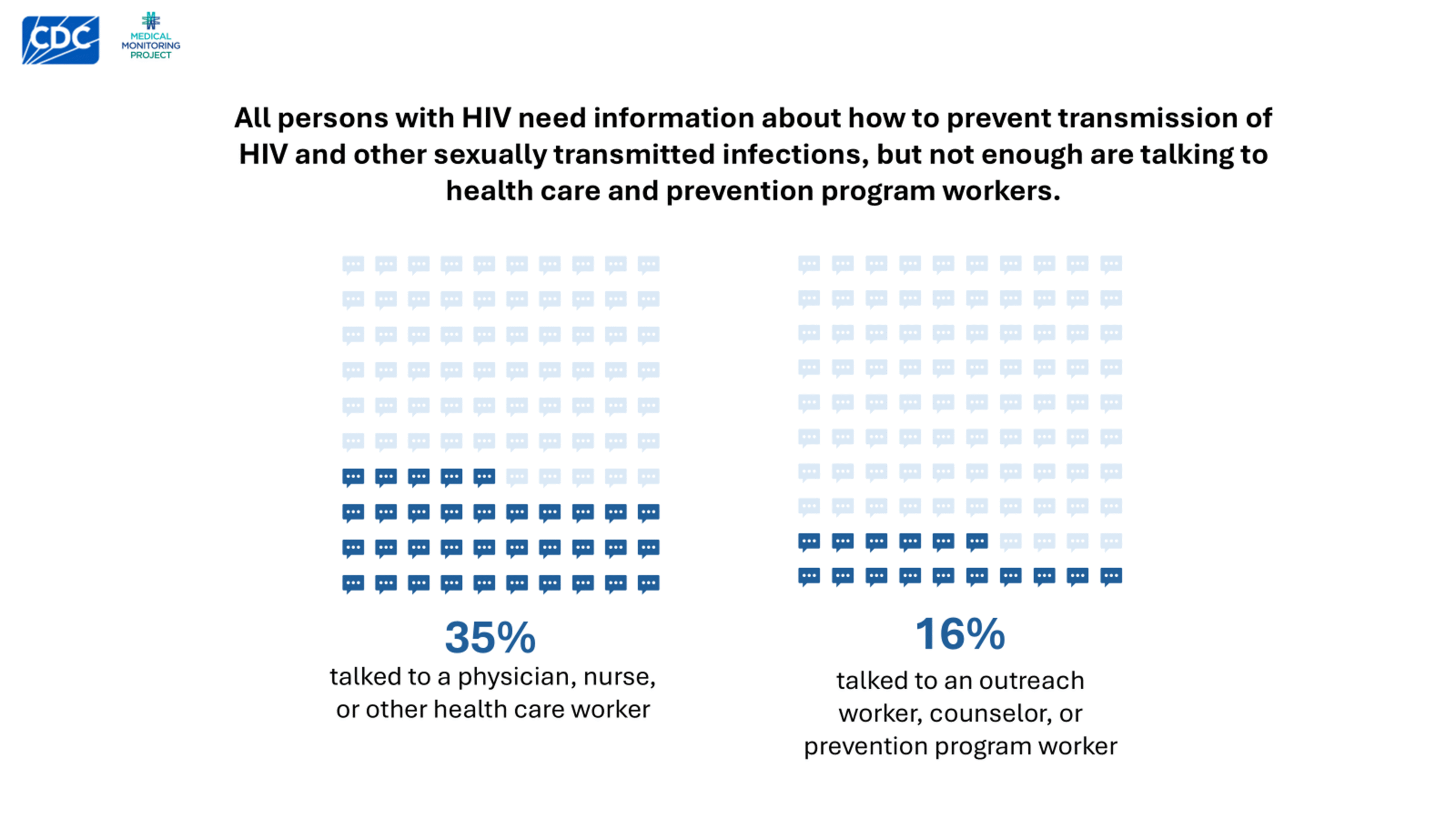 - 35% talked to a physician, nurse, or other health care worker about how to prevent HIV or other STIs