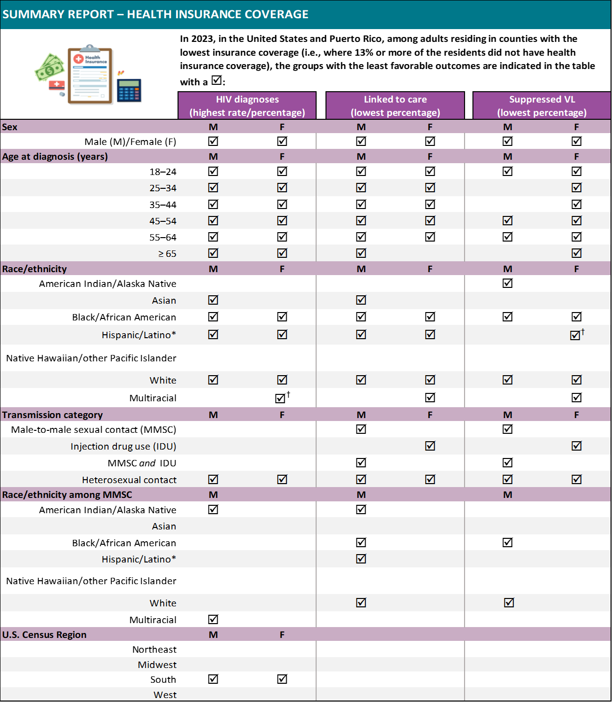 This section presents data for adults with HIV diagnosed during 2023, by selected SDOH indicators. Each report card focuses on one SDOH indicator and identifies the groups living in counties with the greatest economic and social challenges who had the least favorable outcomes: