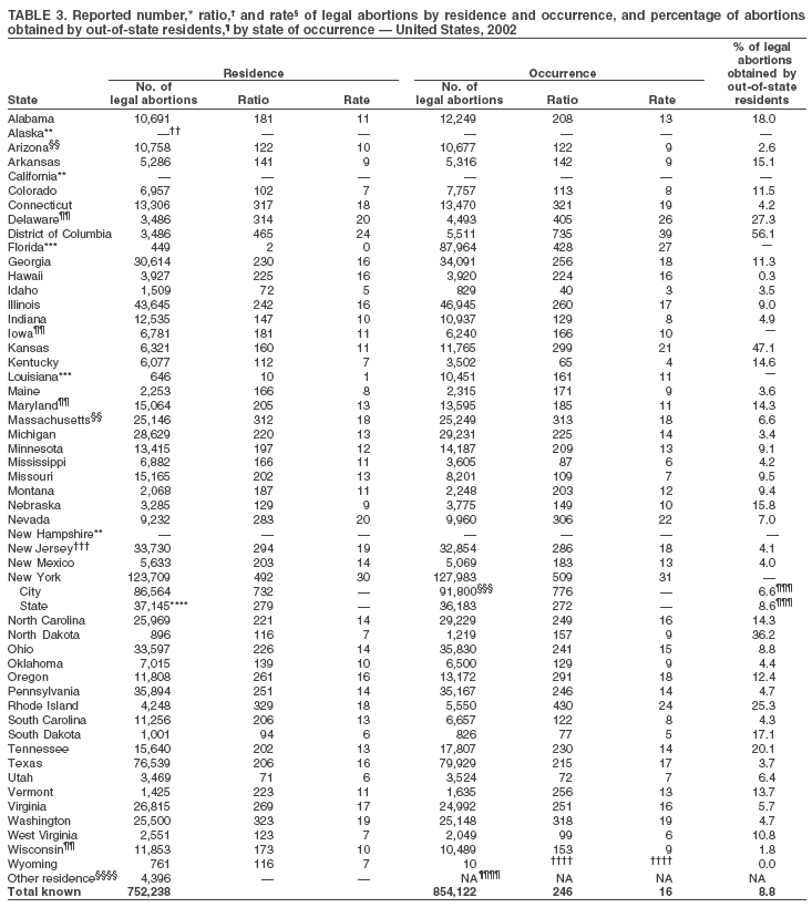 * Includes state, DC, and NYC health departments. Wyoming reported four abortions that occurred in 2001. As a result of the small number and because computing abortion ratios and rates for such a limited number is not appropriate, Wyoming was not included in this sequence in the text. § Ratios for adolescents aged <15 years differ in Tables 4 and 5 because a different number of areas reported; Table 4 includes 48 reporting areas, and Table 5 includes 46. ¶ Medical (nonsurgical) abortion procedures involve the administration of a medication or medications to induce abortion. ** After exclusion of nine areas in which ethnicity data were unknown for >15% of women who obtained an abortion. Table 1