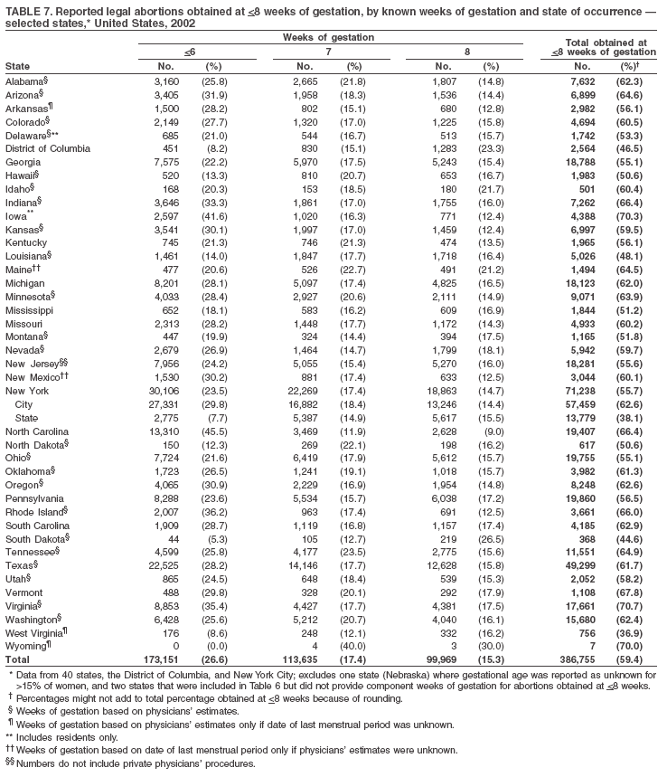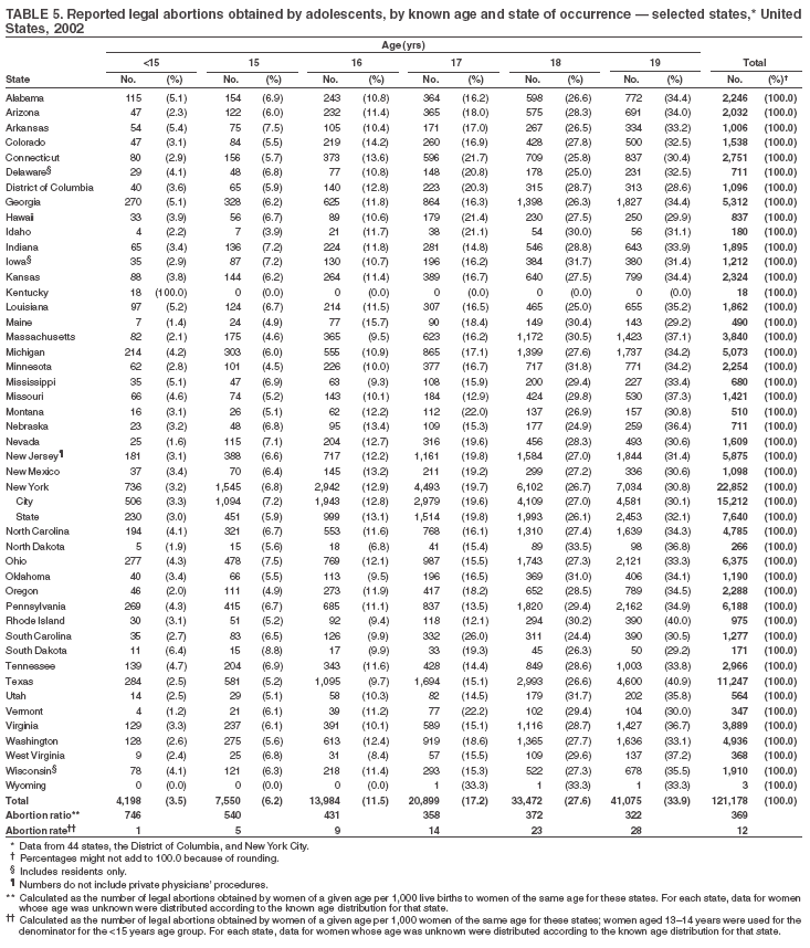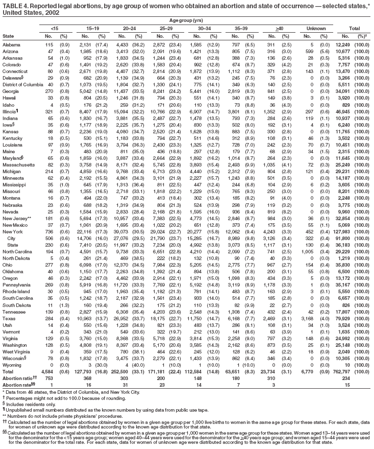 The material in this report originated in the National Center for Chronic Disease Prevention and Health Promotion, Janet Collins, PhD, Director; and the Division of Reproductive Health, John Lehnherr, Acting Director. Corresponding address: CDC/National Center for Chronic Disease Prevention and Health Promotion/Division of Reproductive Health, 1600 Clifton Rd., NE, MS K-21, Atlanta, GA 30333; E-mail: cdcinfo@cdc.gov. AbstractProblem/Condition: CDC began abortion surveillance in 1969 to document the number and characteristics of women obtaining legal induced abortions. Reporting Period Covered: This report summarizes and describes data voluntarily reported to CDC regarding legal induced abortions obtained in the United States in 2002. Description of System: For each year since 1969, CDC has compiled abortion data by state or area of occurrence. During 1973--1997, data were received from or estimated for 52 reporting areas in the United States: 50 states, the District of Columbia, and New York City. In 1998 and 1999, CDC compiled abortion data from 48 reporting areas. Alaska, California, New Hampshire, and Oklahoma did not report, and data for these states were not estimated. For 2000--2002, Oklahoma again reported these data, increasing the number of reporting areas to 49. Results: A total of 854,122 legal induced abortions were reported to CDC for 2002 from 49 reporting areas, representing a 0.1% increase from the 853,485 legal induced abortions reported by the same 49 reporting areas for 2001. The abortion ratio, defined as the number of abortions per 1,000 live births, was 246 in 2002, the same as reported for 2001. The abortion rate was 16 per 1,000 women aged 15--44 years for 2002, the same as for 2001. For the same 48 reporting areas, the abortion rate remained relatively constant during 1997--2002. The highest percentages of reported abortions were for women who were unmarried (82%), white (55%), and aged <25 years (51%). Of all abortions for which gestational age was reported, 60% were performed at <8 weeks' gestation and 88% at <13 weeks. From 1992 (when detailed data regarding early abortions were first collected) through 2002, steady increases have occurred in the percentage of abortions performed at <6 weeks' gestation. A limited number of abortions was obtained at >15 weeks' gestation, including 4.1% at 16--20 weeks and 1.4% at >21 weeks. A total of 35 reporting areas submitted data stating that they performed and enumerated medical (nonsurgical) procedures, accounting for 5.2% of all known reported procedures from the 45 areas with adequate reporting on type of procedure. Interpretation: During 1990--1997, the number of legal induced abortions gradually declined. When the same 48 reporting areas were compared, the number of abortions decreased during 1996--2001, then slightly increased in 2002. In 2000 and 2001, even with one additional reporting state, the number of abortions declined slightly, with a minimal increase in 2002. Public Health Action: Abortion surveillance in the United States continues to provide the data necessary for examining trends in numbers and characteristics of women who obtain legal induced abortions and to increase understanding of this pregnancy outcome. Policymakers and program planners use these data to improve the health and well-being of women and infants. IntroductionCDC began conducting abortion surveillance in 1969 to document the number and characteristics of women obtaining legal induced abortions and to monitor this outcome of unintended pregnancies. This report is based on abortion data for 2002 provided voluntarily to CDC's National Center for Chronic Disease Prevention and Health Promotion (NCCDPHP), Division of Reproductive Health. MethodsFor 2002, CDC compiled data that were voluntarily provided from 49 reporting areas in the United States: 47 states (excluding Alaska, California, and New Hampshire), the District of Columbia (DC), and New York City (NYC). Legal induced abortion was defined as a procedure, performed by a licensed physician or someone acting under the supervision of a licensed physician, that was intended to terminate a suspected or known intrauterine pregnancy and to produce a nonviable fetus at any gestational age (1,2). The total number of legal induced abortions was available from all reporting areas; however, not all of these areas collected data on some or all characteristics of women who obtained abortions, and the availability of such data varied by reporting area. Data on the age of women who obtained abortions were collected and reported adequately (i.e., categorized in accordance with surveillance variables and with <15% unknown values) in 48 reporting areas (46 states, DC, and NYC), representing 89% of all reported procedures, whereas data on ethnicity were collected and reported adequately in only 29 reporting areas, representing 58% of all reported procedures. The findings in this report reflect characteristics of women only from reporting areas that submitted adequate data for the characteristics being examined. For the majority of state tables, the percentage data include a category for unknown values, and the percentage known to be in each category is actually a slight understatement of the true percentage in that category. However, for trend data, out-of-area residents, adolescent ages, and two-characteristics tables, percentages presented are based on known values only. For the 49 reporting areas, data concerning the number of women obtaining legal induced abortions were provided by the central health agency.* These agencies provided data on numbers of abortions and characteristics of women obtaining abortions by the reporting area in which the abortion was performed (i.e., state of occurrence). For the majority of reporting areas, abortion totals were also available by the woman's state or area of residence. However, three states (Delaware, Maryland, and Wisconsin) reported characteristics only for 