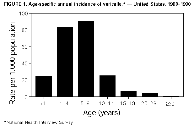 Age-specific incidence data were derived from NHIS for the period 1980-1990 (CDC, unpublished data). An estimated 33% of cases occurred in preschool-age children (i.e., children 1-4 years of age {annual incidence rate: 82.8 cases per 1,000 children}), and 44% occurred in school-age children (i.e., children 5-9 years of age {annual incidence rate: 91.1 cases per 1,000 children}) (Figure_1). More than 90% of cases occurred in persons less than 15 years of age, and few cases occurred in persons greater than 49 years of age. Epidemiologic and serologic studies confirm that greater than 90% of adults are immune to VZV (CDC, unpublished data;1). Rates of immunity may be lower for adults who were raised in certain tropical or subtropical areas (e.g., Puerto Rico) (2).