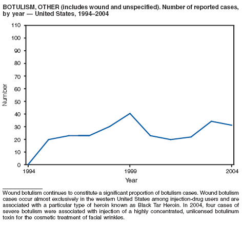 Botulism is a severe paralytic illness caused by the toxins of Clostridium botulinum. Exposure to toxin can occur by ingestion (foodborne botulism), in situ production from C. botulinum colonization of a wound (wound botulism) or the gastrointestinal tract (infant botulism), or by injection of pharmacologic preparations of toxin (treatment-associated botulism) (1). In 2004, cases were attributed to foodborne botulism, wound botulism, infant botulism, and treatment-associated botulism resulting from injection of an unlicensed concentrated preparation of toxin (2).