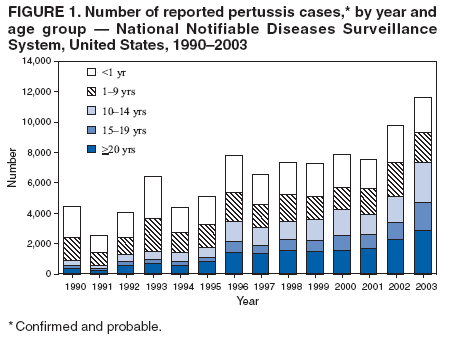 Persons using assistive technology might not be able to fully access information in this file. For assistance, please send e-mail to: mmwrq@cdc.gov. Type 508 Accommodation and the title of the report in the subject line of e-mail. Pertussis --- United States, 2001--2003Pertussis is a highly contagious, vaccine-preventable bacterial illness characterized by paroxysmal cough, posttussive vomiting, and inspiratory whoop. Pertussis also can occur as a mild or moderate cough illness in persons who are partially immune (1). In the United States, most hospitalizations and nearly all deaths from pertussis are reported in infants aged <6 months, but substantial morbidity does occur in other age groups. Infant/childhood vaccination has contributed to a reduction of more than 90% in pertussis-related morbidity and mortality since the early 1940s in the United States (1). Estimates of childhood vaccination coverage with >3 doses of pertussis-containing vaccine have exceeded 90% since 1994; however, reported pertussis cases increased from a historic low of 1,010 in 1976 to 11,647 cases in 2003 (2). A substantial increase in reported cases has occurred among adolescents, who become susceptible to pertussis approximately 6--10 years after childhood vaccination (3,4). Recently, booster vaccines for adolescents and adults combining pertussis antigens with tetanus and diphtheria toxoids (Tdap) were approved by the Food and Drug Administration (FDA).* On June 30, 2005, the Advisory Committee on Immunization Practices (ACIP) recommended Tdap for all persons aged 11--18 years. This report summarizes national surveillance data on pertussis reported to CDC during 2001--2003 and focuses on pertussis reported among persons aged 10--19 years before implementation of national recommendations for adolescent pertussis vaccination. Pertussis cases are reported weekly by state health departments to CDC through the National Notifiable Diseases Surveillance System (NNDSS); more detailed information about cases is provided through the linked Supplementary Pertussis Surveillance System (SPSS). Probable and confirmed cases are reported; however, six states do not report probable cases. A clinical case is defined as an acute cough illness lasting >14 days in a person with at least one symptom characteristic of pertussis (i.e., paroxysmal cough, posttussive vomiting, or inspiratory whoop) or >14 days of cough in an outbreak setting. A confirmed case is defined as 1) a cough illness of any duration with isolation by culture of Bordetella pertussis or 2) a case that is consistent with the clinical case definition and is confirmed by polymerase chain reaction (PCR) testing or epidemiologic linkage to a laboratory-confirmed case. In addition, Massachusetts uses an in-state, standardized serologic assay for persons aged >11 years as a confirmatory test. A probable case is defined as a case that is consistent with the clinical case definition but does not have laboratory confirmation or an epidemiologic link. Direct fluorescent antibody (DFA) assays are no longer recommended for pertussis testing; however, cases continue to be reported as confirmed by DFA. For this report, age-specific and race-specific incidence rates were calculated using U.S. Census Bureau population estimates for 2001--2003. During 2001--2003, a total of 28,998 cases of pertussis were reported to NNDSS from the 50 states and the District of Columbia (7,580 in 2001; 9,771 in 2002; and 11,647 in 2003); 69% of these cases were reported as confirmed. Among all pertussis cases, 15,620 (54%) were in females. Overall in the United States, the average annual incidence was 3.3 cases per 100,000 population (2.7 in 2001, 3.4 in 2002, and 4.0 in 2003). Among 28,923 (99.7%) persons with pertussis for whom age was reported, 6,608 (23%) were aged <1 year (including 5,872 aged <6 months), 3,353 (12%) were aged 1--4 years, 2,553 (9%) were aged 5--9 years, 9,609 (33%) were aged 10--19 years, and 6,800 (23%) were aged >20 years (Figure 1). By age group, average annual incidence was highest (55.2 per 100,000 population) among infants aged <1 year; within that group, incidence was 98.2 for infants aged <6 months and 12.3 for infants aged 6--11 months. Incidence was lower for older groups: 7.2 per 100,000 population for children aged 1--4 years, 4.3 for children aged 5--9 years, 7.7 for persons aged 10--19 years, and 1.1 for adults aged >20 years. During 2001--2003, the annual incidence of pertussis among persons aged 10--19 years increased from 5.5 per 100,000 in 2001, to 6.7 in 2002, and 10.9 in 2003. Race and Hispanic ethnicity were considered independently. Data on race were available for 24,024 (83%) persons with pertussis. Of these, 21,597 (90%) were white, 1,621 (7%) were black, 288 (1%) were American Indian/Alaska Native, 337 (1%) were Asian/Pacific Islander, and 181 (1%) were identified as "other race." Among the 7,991 (83%) persons aged 10--19 years whose race was reported, 7,549 (95%) were white and 265 (3%) were black. Among all age groups, the incidence of reported cases was twice as high among whites as among blacks (3.0 versus 1.4 cases per 100,000 population). After stratifying by state, the white-to-black incidence rate ratio was 1.6. Data on Hispanic ethnicity were available for 23,669 (82%) persons with pertussis. Of these, 3,871 (16%) were Hispanic. Among infants aged <6 months, 1,701 (29%) of 5,872 with pertussis were Hispanic; by comparison, an estimated 18% of infants born each year in the United States are Hispanic. Of 9,609 persons aged 10--19 years with reported pertussis, 116 (1%) of 8,286 for whom information was provided were hospitalized, 148 (2%) of 7,560 had radiographically confirmed pneumonia, and 20 (0.2%) of 8,543 reported seizures as a complication of pertussis. Hospitalization and complications of pertussis were most common among infants aged <6 months. Of the total 5,872 infants aged <6 months, 3,255 (69%) of 4,748 for whom information was pro