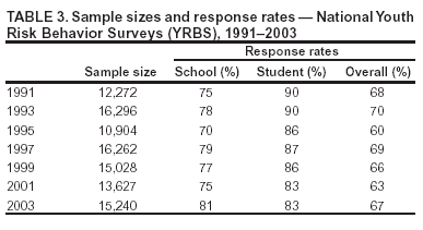Sampled schools, classes, and students who refuse to participate in the survey are not replaced. Sampling without replacement maintains the integrity of the sample design and helps avoid the introduction of unmeasurable bias into the sample. Response rates and total sample sizes for the national school-based surveys conducted from 1991 through 2003 are presented in this report (Table 3).