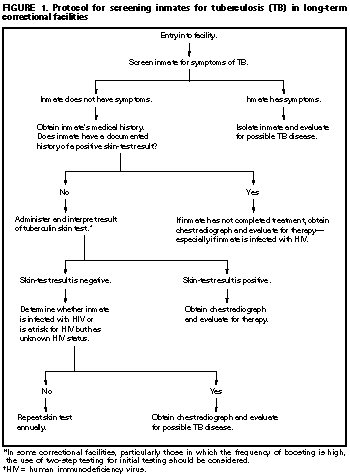 Persons who have a positive skin-test result and no symptoms suggestive of TB should be screened with a chest radiograph within 72 hours after the skin test is interpreted. Persons who have symptoms suggestive of TB disease should be evaluated immediately (see Symptom Screening). Vaccination with BCG, a TB vaccine used in many countries, can cause a reaction to the tuberculin skin test. No reliable method can distinguish tuberculin reactions caused by BCG from those caused by infection with M. tuberculosis. However, a diagnosis of M. tuberculosis infection and the use of preventive therapy should be considered for any BCG-vaccinated person who has a tuberculin skin-test reaction of greater than or equal to 10 mm of induration, especially if any of the following circumstances are present: a) the vaccinated person is a contact of another person who has infectious TB, particularly if the infectious person has transmitted M. tuberculosis to other persons; b) the vaccinated person was born or has resided in a country in which the prevalence of TB is high; or c) the vaccinated person is exposed continually to populations in which the prevalence of TB is high (e.g., some health-care workers, employees and volunteers at homeless shelters, and workers at drug-treatment centers) (43). A diagnosis of active TB disease should be considered for BCG- vaccinated persons -- regardless of their tuberculin skin-test results or HIV serostatus -- if they have symptoms suggestive of TB, especially if they have been exposed recently to infectious TB. HIV-infected inmates who are at high risk for infection with M. tuberculosis and who do not react to tuberculin may be evaluated for skin-test anergy. Anergy testing is accomplished by using the Mantoux technique to administer at least two antigens other than tuberculin (e.g., tetanus toxoid, mumps, or Candida) (44). However, the scientific basis for anergy testing is not well established, and the skin-test antigens currently used for anergy testing have not been standardized. Therefore, all HIV-infected persons, regardless of whether they are anergic, should be screened with a chest radiograph and further diagnostic evaluation if indicated. Medical and nonmedical personnel should safeguard the confidentiality of sensitive information while screening persons for infection with M. tuberculosis or active TB disease. Two-Step Tuberculin Skin-Test Screening Some persons who are skin tested many years after infection with M. tuberculosis have a negative reaction to an initial tuberculin skin test, followed by a positive reaction to a subsequent skin test; this phenomenon is referred to as a boosted reaction. Boosted reactions to tuberculin skin tests are common in older adults and in persons who have been vaccinated with BCG. To reduce the likelihood of misinterpreting a boosted reaction as a new infection, two-step testing is used for baseline testing of persons who periodically will receive tuberculin skin tests. If the result of the first test is positive, the person is considered infected with M. tuberculosis; if negative, a second test should be administered 1 3 weeks later. To eliminate one appointment, some correctional facilities wait until 1 week after the first test both to interpret the reaction to the first test and to administer the second test to tuberculin-negative persons. The reaction to the second test should be interpreted 48 72 hours after the injection. A positive reaction to the second test probably represents a boosted reaction and is not considered a skin-test conversion. Persons who have a negative reaction to the second test should be classified as uninfected. In persons who have a negative skin-test result, a positive reaction to any subsequent test is considered a skin-test conversion and is likely to represent new infection with M. tuberculosis. Initial Screening The following procedures should be used for the initial screening of inmates, depending on their length of stay in the facility and the type of facility, and for all correctional-facility employees, regardless of the type of facility. Inmates in Long-Term Correctional Facilities Symptom screening should be done as soon as possible for all new inmates. Any inmate who has symptoms suggestive of TB should be placed immediately in a TB isolation room and evaluated promptly for TB disease. In addition, tuberculin skin-test screening of all inmates who do not have a documented history of a positive skin-test result should be mandatory in long-term correctional facilities. Decisions concerning the use of two-step skin testing for inmates entering the facility should be based on the frequency of boosting in the facility; in some facilities, two-step testing may provide a more reliable baseline. Persons who have a positive skin-test result should be screened with a chest radiograph and should be given a thorough medical evaluation; if active TB disease is excluded as a diagnosis, preventive therapy should be considered for these persons. Regardless of their tuberculin skin-test status, inmates known to have HIV infection, as well as inmates who are at risk for HIV infection but whose HIV status is unknown, should have a chest radiograph taken as part of the initial screening (Figure_1) (1). Inmates in Short-Term Correctional Facilities that Provide Service to Populations at High Risk for TB As in long-term facilities, symptom screening should be done as soon as possible for all new inmates in short-term facilities. Any inmate who has symptoms suggestive of TB should be placed immediately in a TB isolation room and promptly evaluated for TB disease. Tuberculin skin-test screening usually is not feasible for short-term inmates. However, long-term inmates who reside in short-term facilities and who do not have a documented history of a positive skin-test result should be tuberculin tested within 14 days of entry. Persons who have a positive skin-test result should have a chest radiograph take