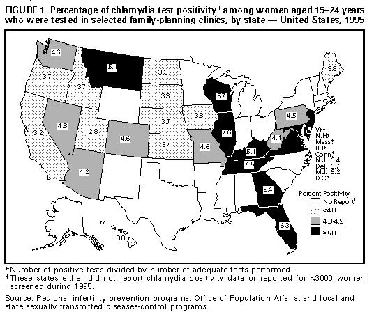 Persons using assistive technology might not be able to fully access information in this file. For assistance, please send e-mail to: mmwrq@cdc.gov. Type 508 Accommodation and the title of the report in the subject line of e-mail. Chlamydia trachomatis Genital Infections -- United States, 1995Genital tract infections with Chlamydia trachomatis are a major cause of pelvic inflammatory disease (PID), ectopic pregnancy, and infertility among women, and perinatal transmission of C. trachomatis to infants can cause neonatal conjunctivitis and pneumonia. In 1994, the estimated cost of untreated chlamydial infections and their complications was $2 billion in the United States (1). To determine the number of reported cases of infection and to assess the impact of screening and treatment programs on chlamydial infection in 1995, CDC analyzed notifiable disease surveillance data on chlamydia and data on chlamydia test positivity among women screened in family-planning clinics funded through CDC and the Office of Population Affairs as a result of the Preventive Health Amendments of 1992