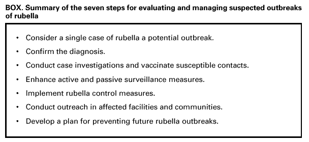 The seven steps described in this section are recommended for the evaluation, management, and surveillance of suspected rubella outbreaks (Box). They are based on recent experience with outbreaks in the United States (4,5). These recommendations can be used in settings beyond those discussed in this report.