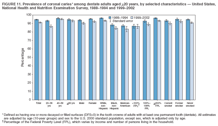 Despite gains in oral health associated with dental caries, disparities remain. Overall, non-Hispanic white survey participants had a lower prevalence and severity of disease and lower prevalence of untreated decay compared with non-Hispanic black and Mexican-American participants. In addition, those with family incomes >200% of the FPL also had lower prevalence and severity of disease than others with lower family incomes. These results are consistent with reports that associate poverty, lower income and education, and certain racial/ethnic groups with higher levels of dental caries among adults and children (30). In addition, these results also support an association between tobacco use, dental caries, and tooth loss (31--33), which might have both a biologic and socioeconomic etiologic link.