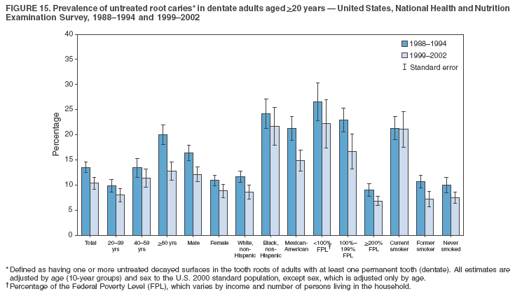 Dye, DDS,3 The material in this report originated in the National Center for Chronic Disease Prevention and Health Promotion, George A. Mensah, MD, Acting Director; and the Division of Oral Health, William Maas, DDS, Director. Corresponding author: Eugenio D. Beltrán-Aguilar, DMD, Division of Oral Health, National Center for Chronic Disease Prevention and Health Promotion, MS F-10, 4770 Buford Hwy, NE Atlanta, GA 30341; Telephone: 770-488-6069; Fax: 770-488-6080; E-mail: edb4@cdc.gov. Abstract Problem/Condition: Dental caries is a common chronic disease that causes pain and disability across all age groups. If left untreated, dental caries can lead to pain and infection, tooth loss, and edentulism (total tooth loss). Dental sealants are effective in preventing dental caries in the occlusal (chewing) and other pitted and fissured surfaces of the teeth. Enamel fluorosis is a hypomineralization of enamel related to fluoride exposure during tooth formation (first 6 years for most permanent teeth). Exposure to fluoride throughout life is effective in preventing dental caries. This is the first CDC Surveillance Summary that addresses these conditions and practices. Reporting Period: 1988--1994 and 1999--2002. System Description: The National Health and Nutrition Examination Survey (NHANES) is an ongoing survey of representative samples of the civilian, noninstitutionalized U.S. population aged >2 months in NHANES 1988--1994 and all ages during 1999--2002. The dental component gathered information on persons aged >2 years. Results: During 1999--2002, among children aged 2--11 years, 41% had dental caries in their primary teeth. Forty-two percent of children and adolescents aged 6--19 years and approximately 90% of adults had dental caries in their permanent teeth. Among children aged 6--19 years, 32% had received dental sealants. Adults aged >20 years retained a mean of 24 of 28 natural teeth and 8% were edentulous. Among persons aged 6--39 years, 23% had very mild or greater enamel fluorosis. Disparities were noticed across all age groups, among racial/ethnic groups, persons with lower education and income, and by smoking status. From 1988--1994 to 1999--2002, four trends were observed: 1) no change in the prevalence of dental caries in primary teeth among children aged 2--11 years, 2) a reduction in prevalence of caries in permanent teeth of up to 10 percentage points among persons aged 6--19 years and up to six percentage points among dentate adults aged >20 years, 3) an increase of 13 percentage points in dental sealants among persons aged 6--19 years, and 4) a six percentage point reduction in total tooth loss (edentulism) among persons aged >60 years. Interpretation: The findings of this report indicate that the dental caries status of permanent teeth has improved since the 1988--1994 survey. Despite the decrease in caries prevalence and severity in the permanent dentition and the increase in the proportion of children and adolescents who benefit from dental sealants, disparities remain. Public Health Action: These data provide information for public health professionals in designing interventions to improve oral health and to reduce disparities in oral health, for researchers in assessing factors associated with disparities and dental caries in primary teeth, and in designing timely surveillance tools to monitor total fluoride exposure. IntroductionSince 1996, a consortium formed by CDC and the National Institute of Dental and Craniofacial Research (NIDCR) has developed and implemented a plan to use the National Health and Nutrition Examination Survey (NHANES) to obtain epidemiologic estimates of dental conditions and preventive efforts. NHANES provides data for oral health surveillance at the national level. The specific objectives are to 1) assess the prevalence of major oral diseases and conditions, including dental caries, periodontal diseases, dental trauma, and enamel fluorosis; 2) assess efforts to prevent disease and disability, including prevalence of dental sealants and use/status of dentures; 3) monitor the oral health status of minority and underserved populations; and 4) provide estimates to evaluate the national health objectives for 2000 and 2010 related to oral health. Beginning in 1999, NHANES changed from a periodic, multiyear survey to a continuous, annual survey. Unlike previous NHANES surveys, beginning in 1999, data on a nationally representative sample of the U.S., noninstitutionalized civilian population from birth and all ages were released on a 2-year cycle. Oral health data were collected for persons aged >2 years, and data for NHANES 1999--2000 and for NHANES 2001--2002 were released for public use in March 2004 and in February 2005, respectively. This report was prepared by members of the consortium and provides summary data for study participants (SPs) for selected elements of the dental component (i.e., dental caries, dental sealants, enamel fluorosis, tooth retention, and edentulism [total tooth loss]). In this report, data from NHANES 1999--2000 and NHANES 2001--2002 were used in the aggregate and are referred to as NHANES 1999--2002. In addition, recalculated estimates for NHANES III (1988--1994), using comparable variables and age groups, were included to assess trends. MethodsNHANES 1999--2002 oversampled certain population subgroups to improve reliability of epidemiologic estimates. Expanded sampling included adolescents aged 12--19 years, persons aged >60 years, Mexican-Americans, non-Hispanic blacks, and persons of low-income. NHANES 1988--1994 oversampled children aged <6 years, persons aged >60 years, Mexican-Americans, and non-Hispanic blacks. Details of NHANES sample design, methods, and protocols are available at http://www.cdc.gov/nchs/about/major/nhanes/currentnhanes.htm. Oral health information was collected through face-to-face interviews by a trained interviewer in a participant's home and a dental examination conducted by a trained denti