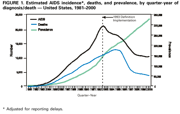 AIDS incidence increased rapidly through the 1980s, peaked in the early 1990s, and then declined (Figure 1). The peak of new diagnoses was associated with the expansion of the AIDS surveillance case definition in 1993 (2). As of 1996, sharp declines were reported in AIDS incidence and deaths. From 1998 through June 2000, AIDS incidence and deaths leveled off and AIDS prevalence continued to increase. Throughout the epidemic, approximately 85% of persons diagnosed with AIDS were aged 20--49 years (Table 1).
