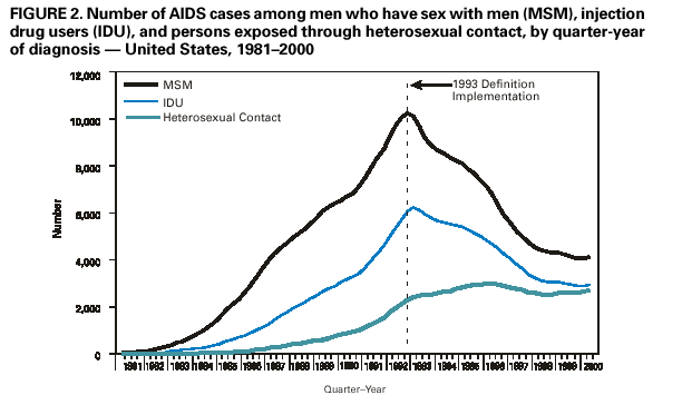 Male-to-male sex has been the most common mode of exposure among persons reported with AIDS (46%), followed by injection drug use (25%) and heterosexual contact (11%). The incidence of AIDS increased rapidly in all three of these risk categories through the mid-1990s; however, since 1996, declines in new AIDS cases have been higher among MSM and injection drug users than among persons exposed through heterosexual contact (Figure 2).
