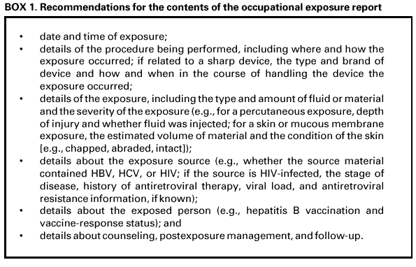 INTRODUCTIONAvoiding occupational blood exposures is the primary way to prevent transmission of hepatitis B virus (HBV), hepatitis C virus (HCV), and human immunodeficiency virus (HIV) in health-care settings (1). However, hepatitis B immunization and postexposure management are integral components of a complete program to prevent infection following bloodborne pathogen exposure and are important elements of workplace safety (2). The U.S. Public Health Service (PHS) has published previous guidelines for the management of HIV exposures that included considerations for postexposure prophylaxis (PEP) (3--5). Since publication of the 1998 HIV exposure guidelines (5), several new antiretroviral agents have been approved by the Food and Drug Administration (FDA), and more information is available about the use and safety of HIV PEP (6--11). In addition, questions exist regarding considerations about PEP regimens when the source person's virus is known or suspected to be resistant to one or more of the antiretroviral agents that might be used for PEP. Concern also has arisen about the use of PEP when it is not warranted. Data indicate that some health-care personnel (HCP) take a full course of HIV PEP after exposures that do not confer an HIV transmission risk (10,11). In September 1999, a meeting of a PHS interagency working group* and expert consultants was convened by CDC. The PHS working group decided to issue updated recommendations for the management of occupational exposure to HIV. In addition, the report was to include recommendations for the management of occupational HBV and HCV exposures so that a single document could comprehensively address the management of occupational exposures to bloodborne pathogens. This report updates and consolidates the previous PHS guidelines and recommendations for occupational HBV, HCV, and HIV exposure management for HCP. Specific practice recommendations for the management of occupational bloodborne pathogen exposures are outlined to assist health-care institutions with the implementation of these PHS guidelines (Appendices A and B). As relevant information becomes available, updates of these recommendations will be published. Recommendations for nonoccupational (e.g., sexual, pediatric, and perinatal) HBV, HCV, and HIV exposures are not addressed in these guidelines and can be found elsewhere (12--15). Definition of Health-Care Personnel and Exposure In this report, health-care personnel (HCP) are defined as persons (e.g., employees, students, contractors, attending clinicians, public-safety workers, or volunteers) whose activities involve contact with patients or with blood or other body fluids from patients in a health-care, laboratory, or public-safety setting. The potential exists for blood and body fluid exposure to other workers, and the same principles of exposure management could be applied to other settings. An exposure that might place HCP at risk for HBV, HCV, or HIV infection is defined as a percutaneous injury (e.g., a needlestick or cut with a sharp object) or contact of mucous membrane or nonintact skin (e.g., exposed skin that is chapped, abraded, or afflicted with dermatitis) with blood, tissue, or other body fluids that are potentially infectious (16,17). In addition to blood and body fluids containing visible blood, semen and vaginal secretions also are considered potentially infectious. Although semen and vaginal secretions have been implicated in the sexual transmission of HBV, HCV, and HIV, they have not been implicated in occupational transmission from patients to HCP. The following fluids also are considered potentially infectious: cerebrospinal fluid, synovial fluid, pleural fluid, peritoneal fluid, pericardial fluid, and amniotic fluid. The risk for transmission of HBV, HCV, and HIV infection from these fluids is unknown; the potential risk to HCP from occupational exposures has not been assessed by epidemiologic studies in health-care settings. Feces, nasal secretions, saliva, sputum, sweat, tears, urine, and vomitus are not considered potentially infectious unless they contain blood. The risk for transmission of HBV, HCV, and HIV infection from these fluids and materials is extremely low. Any direct contact (i.e., contact without barrier protection) to concentrated virus in a research laboratory or production facility is considered an exposure that requires clinical evaluation. For human bites, the clinical evaluation must include the possibility that both the person bitten and the person who inflicted the bite were exposed to bloodborne pathogens. Transmission of HBV or HIV infection only rarely has been reported by this route (18--20) (CDC, unpublished data, 1998). BACKGROUNDThis section provides the rationale for the postexposure management and prophylaxis recommendations presented in this report. Additional details concerning the risk for occupational bloodborne pathogen transmission to HCP and management of occupational bloodborne pathogen exposures are available elsewhere (5,12,13,21-24). Occupational Transmission of HBV Risk for Occupational Transmission of HBV HBV infection is a well recognized occupational risk for HCP (25). The risk of HBV infection is primarily related to the degree of contact with blood in the work place and also to the hepatitis B e antigen (HBeAg) status of the source person. In studies of HCP who sustained injuries from needles contaminated with blood containing HBV, the risk of developing clinical hepatitis if the blood was both hepatitis B surface antigen (HBsAg)- and HBeAg-positive was 22%--31%; the risk of developing serologic evidence of HBV infection was 37%--62%. By comparison, the risk of developing clinical hepatitis from a needle contaminated with HBsAg-positive, HBeAg-negative blood was 1%--6%, and the risk of developing serologic evidence of HBV infection, 23%--37% (26). Although percutaneous injuries are among the most efficient modes of HBV transmission, these exposures probabl