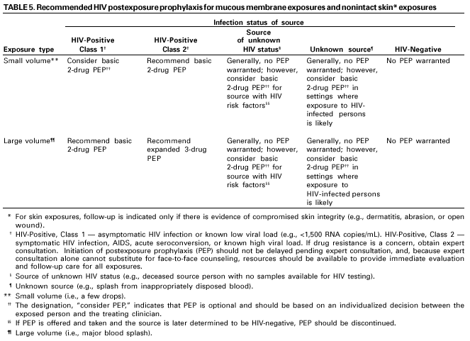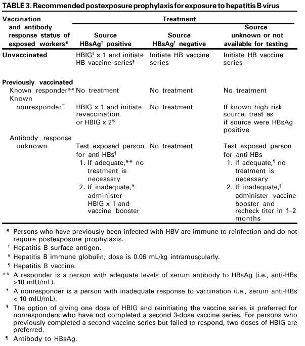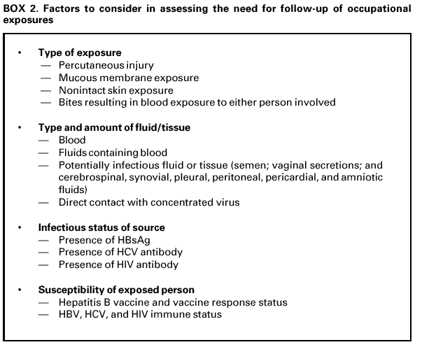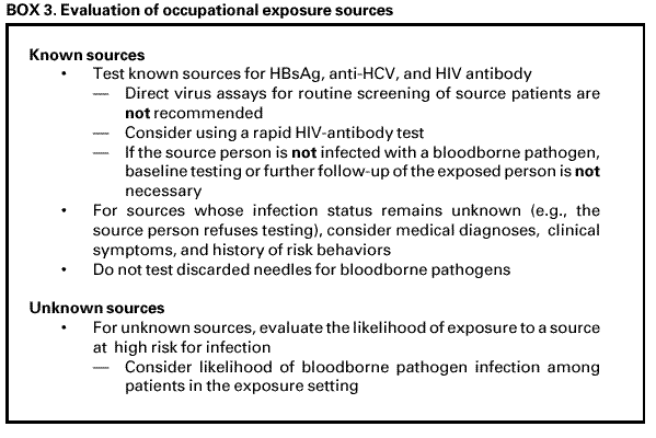 Persons using assistive technology might not be able to fully access information in this file. For assistance, please send e-mail to: mmwrq@cdc.gov. Type 508 Accommodation and the title of the report in the subject line of e-mail. Updated U.S. Public Health Service Guidelines for the Management of Occupational Exposures to HBV, HCV, and HIV and Recommendations for Postexposure ProphylaxisPlease note: An update has been published for this report. To view the update, please click here. SummaryThis report updates and consolidates all previous U.S. Public Health Service recommendations for the management of health-care personnel (HCP) who have occupational exposure to blood and other body fluids that might contain hepatitis B virus (HBV), hepatitis C virus (HCV), or human immunodeficiency virus (HIV). Recommendations for HBV postexposure management include initiation of the hepatitis B vaccine series to any susceptible, unvaccinated person who sustains an occupational blood or body fluid exposure. Postexposure prophylaxis (PEP) with hepatitis B immune globulin (HBIG) and/or hepatitis B vaccine series should be considered for occupational exposures after evaluation of the hepatitis B surface antigen status of the source and the vaccination and vaccine-response status of the exposed person. Guidance is provided to clinicians and exposed HCP for selecting the appropriate HBV PEP. Immune globulin and antiviral agents (e.g., interferon with or without ribavirin) are not recommended for PEP of hepatitis C. For HCV postexposure management, the HCV status of the source and the exposed person should be determined, and for HCP exposed to an HCV positive source, follow-up HCV testing should be performed to determine if infection develops. Recommendations for HIV PEP include a basic 4-week regimen of two drugs (zidovudine [ZDV] and lamivudine [3TC]; 3TC and stavudine [d4T]; or didanosine [ddI] and d4T) for most HIV exposures and an expanded regimen that includes the addition of a third drug for HIV exposures that pose an increased risk for transmission. When the source person's virus is known or suspected to be resistant to one or more of the drugs considered for the PEP regimen, the selection of drugs to which the source person's virus is unlikely to be resistant is recommended. In addition, this report outlines several special circumstances (e.g., delayed exposure report, unknown source person, pregnancy in the exposed person, resistance of the source virus to antiretroviral agents, or toxicity of the PEP regimen) when consultation with local experts and/or the National Clinicians' Post-Exposure Prophylaxis Hotline ([PEPline] 1-888-448-4911) is advised. Occupational exposures should be considered urgent medical concerns to ensure timely postexposure management and administration of HBIG, hepatitis B vaccine, and/or HIV PEP.