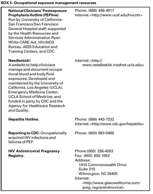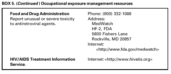 Occupational Exposure Management Resources Several resources are available that provide guidance to HCP regarding the management of occupational exposures. These resources include PEPline; the Needlestick! website; the Hepatitis Hotline; CDC (receives reports of occupationally acquired HIV infections and failures of PEP); the HIV Antiretroviral Pregnancy Registry; FDA (receives reports of unusual or severe toxicity to antiretroviral agents); and the HIV/AIDS Treatment Information Service (Box 5). *This interagency working group comprised representatives of CDC, the Food and Drug Administration (FDA), the Health Resources and Services Administration, and the National Institutes of Health. Information included in these recommendations may not represent FDA approval or approved labeling for the particular product or indications in question. Specifically, the terms "safe" and "effective" may not be synonymous with the FDA-defined legal standards for product approval. References