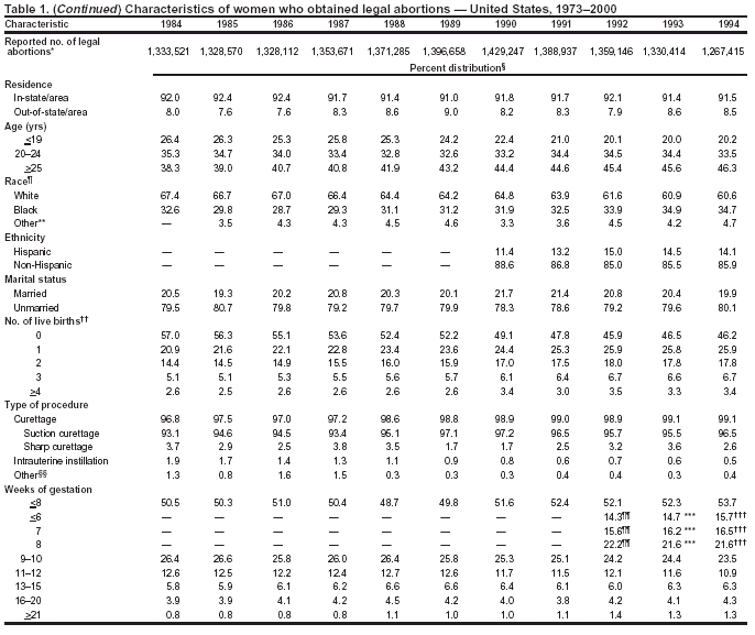 Persons using assistive technology might not be able to fully access information in this file. For assistance, please send e-mail to: mmwrq@cdc.gov. Type 508 Accommodation and the title of the report in the subject line of e-mail. Abortion Surveillance --- United States, 2000Laurie D. Elam-Evans, Ph.D. Abstract Problem/Condition: CDC began abortion surveillance in 1969 to document the number and characteristics of women obtaining legal induced abortions. Reporting Period Covered: This report summarizes and describes data reported to CDC regarding legal induced abortions obtained in the United States in 2000. Description of System: For each year since 1969, CDC has compiled abortion data by state or area of occurrence. During 1973--1997, data were received from or estimated for 52 reporting areas in the United States: 50 states, the District of Columbia, and New York City. In 1998 and 1999, CDC compiled abortion data from 48 reporting areas. Alaska, California, New Hampshire, and Oklahoma did not report, and data for these areas were not estimated. In 2000, Oklahoma again reported these data, increasing the number of reporting areas to 49. Results: A total of 857,475 legal induced abortions were reported to CDC for 2000 from 49 reporting areas, representing a 0.5% decrease from the 861,789 legal induced abortions reported by 48 reporting areas for 1999 and a 1.3% decrease for the same 48 reporting areas that reported in 1999. The abortion ratio, defined as the number of abortions per 1,000 live births, was 246 in 2000 (for the same 48 reporting areas as 1999), compared with 256 reported for 1999. This represents a 3.8% decline in the abortion ratio. The abortion rate (for the same 48 reporting areas as 1999) was 16 per 1,000 women aged 15--44 years for 2000. This was also a 3.8% decrease from the rate reported for procedures performed during 1997--1999 for the same 48 reporting areas. The highest percentages of reported abortions were for women aged <25 years (52%), women who were white (57%), and unmarried women (81%). Fifty-eight percent of all abortions for which gestational age was reported were performed at <8 weeks of gestation, and 88% were performed before 13 weeks. From 1992 (when detailed data regarding early abortions were first collected) through 2000, steady increases have occurred in the percentage of abortions performed at <6 weeks of gestation. Few abortions were performed after 15 weeks of gestation; 4.3% were obtained at 16--20 weeks and 1.4% were obtained at >21 weeks. A total of 31 reporting areas submitted data stating that they performed medical (nonsurgical) procedures, making up 1.0% of all reported procedures from the 42 areas with adequate reporting on type of procedure. In 1998 and 1999 (the most recent years for which data are available), 14 women died as a result of complications from known legal induced abortion. Ten of these deaths occurred in 1998 and four occurred in 1999; no deaths were associated with known illegal abortion. Interpretation: From 1990 through 1997, the number of legal induced abortions gradually declined. In 1998 and 1999, the number of abortions continued to decrease when comparing the same 48 reporting areas. In 2000, even with one additional reporting state, the number of abortions declined slightly. In 1998 and 1999, as in previous years, deaths related to legal induced abortions occurred rarely (<1 death per 100,000 abortions). Public Health Action: Abortion surveillance in the United States continues to provide data necessary for examining trends in numbers and characteristics of women who obtain legal induced abortions and for increasing understanding of one additional aspect of the spectrum of pregnancy outcomes. Policy makers and program planners need these data to improve the health and well-being of women and infants. IntroductionCDC began conducting abortion surveillance in 1969 to document the number and characteristics of women obtaining legal induced abortions and to monitor one outcome of unintended pregnancies. This report is based on abortion data for 2000 provided to CDC's National Center for Chronic Disease Prevention and Health Promotion (NCCDPHP), Division of Reproductive Health. MethodsFor 2000, CDC compiled data that were voluntarily provided from 49 reporting areas in the United States: 47 states (excluding Alaska, California, and New Hampshire), the District of Columbia, and New York City. Legal induced abortion was defined as a procedure, performed by a licensed physician or someone acting under the supervision of a licensed physician, that was intended to terminate a suspected or known intrauterine pregnancy and to produce a nonviable fetus at any gestational age (1,2). The total number of legal induced abortions was available from all reporting areas; however, not all of these areas collected data regarding some or all of the characteristics of women who obtained abortions. Thus, the availability of data on characteristics of women obtaining an abortion varied by reporting area in 2000. Most reporting areas (46 states, the District of Columbia, and New York City) collected and reported adequate data (i.e., data categorized in accordance with surveillance variables and with <15% unknown values) by age of the woman, whereas only 29 states, the District of Columbia, and New York City collected and reported adequate data by Hispanic ethnicity. Therefore, the findings in this report reflect characteristics of women only from reporting areas that submitted adequate data for the characteristics being examined. For the majority of state tables, the percentage data include a category for unknown values. However, for trend data, out-of-area residents, adolescent ages, and two-characteristics tables, percentages presented are based on known values only. For the 49 reporting areas, data concerning the number of women obtaining legal induced abortions were provided by the central health agency.* These agencies provided dat