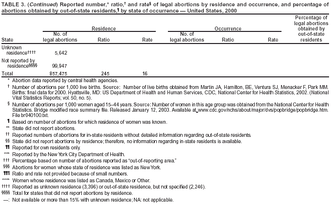 * Includes state health departments and the health departments of New York City and the District of Columbia. Wyoming reported six abortions in 2000. However, because of the inappropriateness of computing abortion rates and ratios for this small number, Wyoming was not included in these calculations. § Ratios for women aged <15 years differ in Table 4 and Table 5 because a different number of areas are reporting; Table 4 includes 48 reporting areas, and Table 5 includes 46. ¶ Medical (nonsurgical) abortion procedures involve the administration of a medication or medications to induce abortion. ** After exclusion of 10 states for which ethnicity data were unknown for >15% of women who obtained an abortion. Coitus-dependent contraceptive methods include male or female condoms, diaphragm, sponge, cream, jelly, or other methods that must be used at the time intercourse occurs. Table 1 ![]() ![]() ![]() Return to top. Figure 1 ![]() Return to top. Table 2 ![]() Return to top. Figure 2 ![]() Return to top. Table 3 ![]() ![]() Return to top. Figure 3 ![]() Return to top. Table 4 ![]() Return to top. Figure 4 ![]() Return to top. Table 5 ![]() Return to top. Table 6 ![]() Return to top. Table 7 ![]() Return to top. Table 8 ![]() Return to top. Table 9 ![]() Return to top. Table 10 ![]() Return to top. Table 11 ![]() Return to top. Table 12 ![]() Return to top. Table 13 ![]() Return to top. Table 14 ![]() Return to top. Table 15 ![]() Return to top. Table 16 ![]() Return to top. Table 17 ![]() Return to top. Table 18 ![]() Return to top. Table 19 ![]() Return to top.