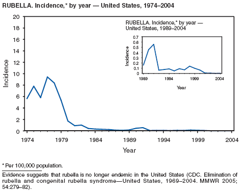 Reef SE, Frey TK, Theall K, et al. The changing epidemiology of rubella in the 1990s: on the verge of elimination and new challenges for control and prevention. JAMA 2002;287;464--72. Reef S, Plotkin S, Cordero J, et al. Preparing for congenital rubella syndrome elimination: summary of the Workshop on Congenital Rubella Elimination in the United States. Clin Infect Dis 2000;31:85--95.