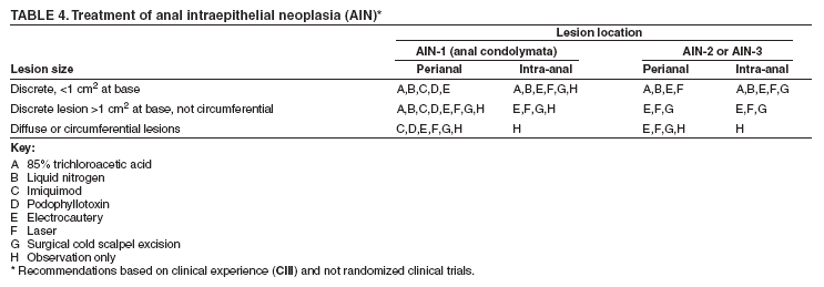 The management of CIN among HIV-1--infected patients should not differ from recently published guidelines (488) (AIII). The majority of specialists recommend observation without specific intervention for CIN 1 unless lesions persist over an 18--24 month period of follow-up, evolve to CIN 2 or worse, or there is poor adherence to routine monitoring. Conventional therapies used for treatment of CIN 2 or 3 include cryotherapy, laser therapy, cone biopsy, and a loop electrosurgical excision procedure (LEEP). LEEP is generally the preferred mode of treatment (BIII). Recurrence rates of 40%--60% after treatment have been reported among HIV-1--infected women undergoing these procedures (497). For AIN, data are insufficient to recommend a specific treatment approach; because the majority of lesions are not visible to the patient, the majority of specialists recommend use of one or more of the provider-applied treatments outlined previously (CIII) (Table 4). Treatment decisions are based on assessment of the size and location of the lesion and the grade of histology. The least aggressive approaches should be tried first whenever possible (CIII). If a lesion is too large or if treatment is expected to produce substantial morbidity, then certain specialists recommend following patients without treatment and periodic examinations to monitor for development of cancer. A study reported a low success rate for surgical fulguration of widespread AIN 2 or 3 among HIV-1--infected persons (498). No indications exist for radiation therapy for patients with AIN in the absence of evidence of invasive cancer (EIII). The results of studies do not indicate that treatment for CIN or AIN should be modified for patients receiving ART. Conversely, no evidence indicates that ART should be instituted or modified for the purpose of treating CIN or AIN (CIII), although limited data indicate that ART might be associated with improved response rates. Monitoring and Adverse Effects As efficacy varies with each of the treatments for genital warts, and recurrences are common, patients should be monitored by physical examination for evidence of recurrence. The major toxicity of podofilox and topical podophyllin is local skin irritation. Also, if podophyllin is applied to a large treatment area, systemic absorption can cause nausea, vomiting, and CNS effects. The major toxicity of imiquimod is inflammation at the application site. The major toxicity of cryotherapy is local pain. The major side effects of surgical treatment for genital warts are local pain, bleeding, and secondary infection. The major adverse events associated with acid cauterization are local pain and irritation or ulceration of adjacent normal skin. Intralesional interferon is associated with systemic toxicities of interferon, including fever, fatigue, myalgia, malaise, depression, and other influenza-like symptoms. For patients with CIN 1 that has not been treated with one of the outlined interventions, Pap smears or colposcopy should be performed every 4--6 months to monitor for persistence or progression of lesions. As the recurrence of CIN and cervical cancer after conventional therapy is increased among HIV-1--infected persons, patients should be carefully followed after treatment with frequent cytologic screening and colposcopic examination when indicated according to published guidelines (498,499). Management of Treatment Failure Treatment failure is defined as the persistence or recurrence of lesions after appropriate therapy. If evidence exists of persistent or recurrent genital warts, re-treatment with any of the modalities previously described should be considered, preferably with an alternative modality to the one that previously failed (AIII). For persistent or recurrent CIN 2 or 3, repeat loop excision or one or more of the other treatment modalities should be considered (AIII) (499). Prevention of Recurrence No indication exists for secondary prophylaxis (chronic maintenance therapy) with any of the conventional modalities to prevent recurrence of genital warts. Patients with CIN should be monitored with frequent cytologic screening and, when indicated, colposcopic examination for recurrent lesions (AI). In a study of HIV-1--infected women treated for high-grade cervical lesions using conventional therapies, low-dose intravaginal 5-fluorouracil (i.e., 2 g twice weekly for 6 months) reduced the short-term risk for recurrence and possibly the grade of recurrence (500). However, clinical experience with this therapy is too limited to provide a recommendation for its use (CIII). Special Considerations During Pregnancy The decision about whether to treat genital warts during pregnancy should be individualized on the basis of the extent of the warts, concurrent symptoms, gestational age, and patient preference (CIII). Podophyllin and podofilox should not be used during pregnancy (EIII). Use of podophyllin has been associated with an increased risk for fetal death in several animal models and case reports in humans, but not with congenital anomalies. No experience with imiquimod in human pregnancy has been reported; therefore, its use in pregnancy is not recommended (DIII). No anomalies have been observed among animals with use during pregnancy. Other topical treatments (e.g., bichloroacetic and trichloroacetic acid) and ablative therapies (i.e., laser, cryotherapy, and excision) can be used during pregnancy. Cervical warts should be biopsied to rule out concomitant dysplasia. Increased bleeding might occur with cervical biopsy during pregnancy. All pregnant women should have a Pap smear at their initial prenatal visit unless a normal cervical cytology result has been obtained within the past year. Cytobrush sampling can be done during pregnancy (501). Pregnant women with abnormal cervical cytology results should undergo colposcopy and cervical biopsy of any abnormalities. Increased bleeding might occur with cervical biopsy during pregnancy. Endocervic