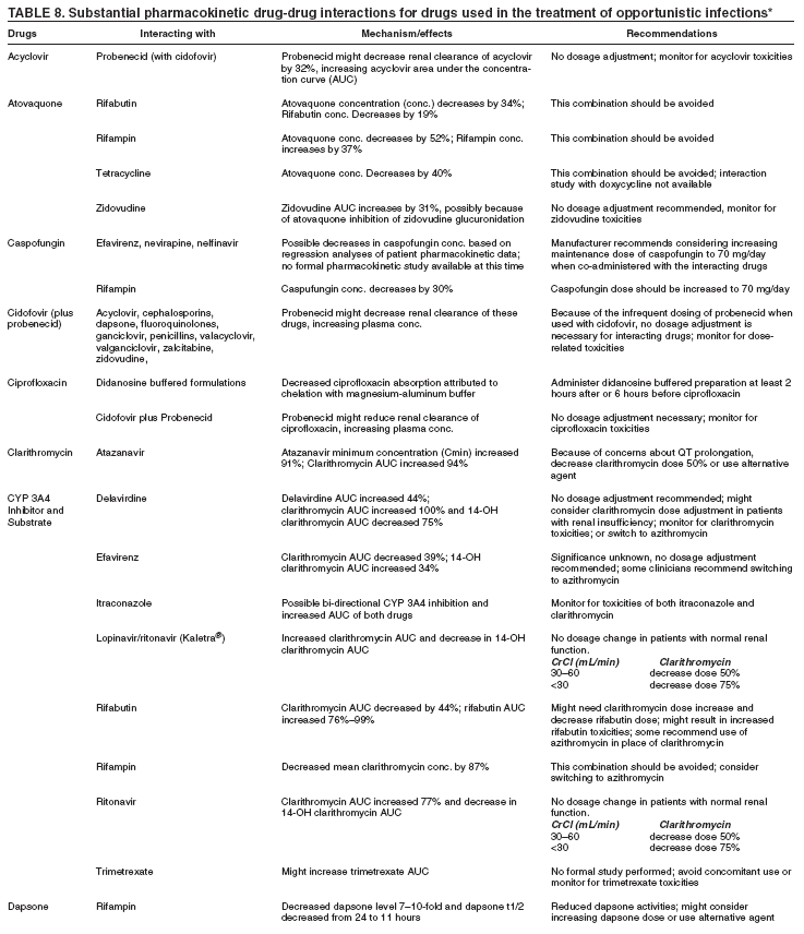 Persons using assistive technology might not be able to fully access information in this file. For assistance, please send e-mail to: mmwrq@cdc.gov. Type 508 Accommodation and the title of the report in the subject line of e-mail. Treating Opportunistic Infections Among HIV-Infected Adults and AdolescentsRecommendations from CDC, the National Institutes of Health, and the HIV Medicine Association/Infectious Diseases Society of AmericaAn erratum has been published for this article. To view the erratum, please click here. Prepared by The material in this report originated in the Office of the Director, National Center for HIV, STD and TB Prevention, Janet L. Collins, M.D., Acting Director. Corresponding Author: Constance A. Benson, M.D., Antiviral Research Center, University of California, San Diego, 150 W. Washington St., Suite 100, San Diego, CA 92103. Telephone: 619-543-8080; Fax: 619-298-0177; e-mail: cbenson@ucsd.edu. Summary The National Institutes of Health, the HIV Medicine Association of the Infectious Diseases Society of America, and CDC have developed guidelines for treatment of opportunistic infections (OIs) among adults and adolescents infected with human immunodeficiency virus (HIV). These guidelines are intended for clinicians and other health-care providers who care for HIV-infected adults and adolescents, including pregnant women; they complement companion guidelines for treatment of OIs among HIV-infected children and previously published guidelines for prevention of OIs in these populations. They include evidence-based guidelines for treatment of 28 OIs caused by protozoa, bacteria, fungi, and viruses, including certain OIs endemic in other parts of the world but that might be observed in patients in the United States. Each OI section includes information on epidemiology, clinical manifestations, diagnosis, treatment recommendations, monitoring and adverse events, management of treatment failure, prevention of recurrence, and special considerations in pregnancy. Tables address drugs and doses, drug toxicities, drug interactions, adjustment of drug doses in persons with reduced renal function, and data about use of drugs in pregnant women. IntroductionOpportunistic infections (OIs) continue to cause morbidity and mortality in patients with human immunodeficiency virus (HIV)-1 infection throughout the world. Potent combination antiretroviral therapy (ART) has reduced the incidence of OIs for certain patients with access to care. However, certain patients in the developed and developing world do not have access to care and have OIs. Other patients do not have a sustained response to antiretroviral agents for multiple reasons, including poor adherence, drug toxicities, drug interactions, or initial acquisition of a drug-resistant strain of HIV-1. Therefore, OIs will continue to cause substantial morbidity and mortality in patients with HIV-1 infection. The therapy of OIs has changed substantially during the AIDS epidemic. As more information about efficacy, toxicity, and interactions of the drugs to treat and prevent OIs has emerged, management strategies have evolved. New drugs have also become available that occupy important roles in our therapeutic armamentarium. These guidelines and the accompanying guidelines, Treating Opportunistic Infections Among HIV-Exposed and Infected Children, join two previous guidelines, The United States Public Health Service-Infectious Diseases Society of America Guidelines for the Prevention of Opportunistic Infections in Persons Infected with the Human Immunodeficiency Virus and The Department of Health and Human Services (DHHS) Guidelines for the Use of Antiretroviral Agents in HIV-Infected Adults and Adolescents. The current guidelines share key features with their companion guidelines: