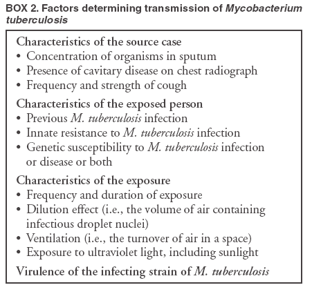 Scientific Basis of TB Control Transmission of TBM. tuberculosis is nearly always transmitted through an airborne route, with the infecting organisms being carried in droplets of secretions (droplet nuclei) that are expelled into the surrounding air when a person with pulmonary TB coughs, talks, sings, or sneezes. Person-to-person transmission of M. tuberculosis is determined by certain characteristics of the source-case and of the person exposed to the source-person and by the environment in which the exposure takes place (Box 2). The virulence of the infecting strain of M. tuberculosis might also be a determining factor for transmission. Characteristics of the Source-Case By the time persons with pulmonary TB come to medical attention, 30%--40% of persons identified as their close personal contacts have evidence of LTBI (30). The highest rate of infection among contacts follows intense exposure to patients whose sputum smears are positive for acid-fast bacilli (AFB) (31,57--59) (Figure 2). Because patients with cavitary pulmonary TB are more likely than those without pulmonary cavities to be sputum AFB smear-positive (60), patients with cavitary pulmonary disease have greater potential to transmit TB. Such persons also have a greater frequency of cough, so the triad of cavitary pulmonary disease, sputum AFB smear-positivity, and frequency of cough are likely related causal factors for infectivity. AFB smear-negative TB patients also transmit TB, but with lower potential than smear-positive patients. Patients with sputum AFB smear-negative pulmonary TB account for approximately 17% of TB transmission (61). Characteristics of the Exposed Person A study of elderly nursing home residents indicated that persons with initially positive tuberculin skin test results during periods of endemic exposure to TB had a much lower risk for TB than those whose skin test results were initially negative (62,63). This finding suggests that preexisting LTBI confers protection against becoming infected upon subsequent exposure and progression to active disease. Similarly, having prior disease caused by M. tuberculosis had been assumed to confer protection against reinfection with a new strain of M. tuberculosis. However, molecular typing of paired isolates of M. tuberculosis from patients with recurrent episodes of TB disease has demonstrated that reinfection does occur among immunocompetent and immunocompromised persons (64,65). The classic means of protecting persons exposed to infectious diseases is vaccination. Because of its proven efficacy in protecting infants and young children from meningeal and miliary TB (66), vaccination against TB with Mycobacterium bovis bacillus Calmette-Guerín (BCG) is used worldwide (although not in the United States). This protective effect against the disseminated forms of TB in infants and children is likely based on the ability of BCG to prevent progression of the primary infection when administered at that stage of life (67). Epidemiologic evidence suggests that BCG immunization does not protect against the development of infection with M. tuberculosis upon exposure (68), and use of BCG has not had an impact on the global epidemiology of TB. One recent retrospective study found that BCG protective efficacy can persist for 50--60 years, indicating that a single dose might have a long duration of effect (69). A meta-analysis indicated that overall BCG reduced the risk for TB 50% (66); however, another meta-analysis that examined protection over time demonstrated a decrease in efficacy of 5%--14% in seven randomized controlled trials and an increase of 18% in three others (70). An effective vaccine against M. tuberculosis is needed for global TB control to be achieved. Because only 30%--40% of persons with close exposure to a patient with pulmonary TB become infected (30,31), innate immunity might protect certain persons from infection (71). The innate mechanisms that protect against the development of infection are largely uncharacterized (71). Although immunocompromised persons (e.g., those with HIV infection) are at increased risk for progression to TB disease after infection with M. tuberculosis, no definitive evidence exists that immunocompromised persons, including those with HIV infection, have increased susceptibility to infection upon exposure. Observational studies suggest that population-based variability in susceptibility to TB might be related to the length of time a population has lived in the presence of M. tuberculosis and has thus developed resistance to infection through natural selection (72--74). However, the genetic basis for susceptibility or resistance to TB is not well understood (72,75). Characteristics of the Exposure Studies that have stratified contacts of persons with pulmonary TB according to time spent with the infected person indicate that the risk for becoming infected with M. tuberculosis is in part determined by the frequency and duration of exposure (60). In a given environment shared by a patient with pulmonary TB and a contact, the risk for transmitting the infection varies with the density of infectious droplet nuclei in the air and how long the air is inhaled. Indoors, tubercle bacilli are expelled into a finite volume of air, and, unless effective ventilation exists, droplet nuclei containing M. tuberculosis might remain suspended in ambient air (76). Exposures in confined air systems with little or no ventilation pose a major risk for transmission of TB; this has been demonstrated in homes, ships, trains, office buildings, and health-care institutions (77--80). When contact occurs outdoors, TB bacilli expelled from the respiratory tract of an infectious person are rapidly dispersed and are quickly rendered nonviable by sunlight (77). The risk for transmission during such encounters is very limited. Considerable attention has been given to transmission of M. tuberculosis during air travel. Investigations have demonstrated that the