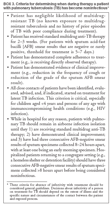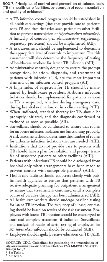 of America (ISDA), and CDC Chair: Charles M. Nolan, MD, Seattle-King County Department of Public Health, Seattle, Washington (American Thoracic Society). Co-chairs: Henry M. Blumberg, MD, Emory University School of Medicine, Atlanta, Georgia (Infectious Diseases Society of America), Zachary Taylor, MD, National Center for HIV, STD, and TB Prevention, CDC, Atlanta, Georgia. Members: John Bernardo, MD, Boston University School of Medicine, Boston, Massachusetts; Patrick J. Brennan, MD, University of Pennsylvania School of Medicine, Philadelphia, Pennsylvania; Nancy E. Dunlap, MD, PhD, University of Alabama at Birmingham, Birmingham, Alabama; Charles L. Daley, MD, National Jewish Medical and Research Center, Denver, Colorado; Wafaa M. El-Sadr, MD, Harlem Hospital and Columbia University, New York City, New York; Sue Etkind, MS, Massachusetts Department of Public Health, Jamaica Plain, Massachusetts; Mark FitzGerald, MD, University of British Columbia, Vancouver, British Columbia, Canada; James B. McAuley, MD, Rush Medical College, Chicago, Illinois; Marisa Moore, MD, Centers for Disease Control and Prevention, Atlanta, Georgia; Noreen L. Qualls, DrPH, Centers for Disease Control and Prevention, Atlanta, Georgia; Randall R. Reves, MD, Denver Public Health, Denver, Colorado; Sarah E. Royce, MD, California Department of Health Services, Berkeley, California; Max Salfinger, MD, Wadsworth Center, New York State Department of Health, Albany, New York; Jeffrey R. Starke, MD, Texas Children's Hospital and Baylor College of Medicine, Houston, Texas; Wanda Walton, PhD, Centers for Disease Control and Prevention, Atlanta, Georgia; Stephen E. Weis, DO, University of North Texas Health Science Center at Fort Worth, Fort Worth, Texas; and Jan Young, MS, California Department of Health Services, Berkeley, California. Table 1 ![]() Return to top. Figure 1 ![]() Return to top. Box 1 ![]() Return to top. Table 2 ![]() Return to top. Figure 2 ![]() Return to top. Box 2 ![]() Return to top. Table 3 ![]() Return to top. Figure 3 ![]() Return to top. Box 3 ![]() Return to top. Table 4 ![]() Return to top. Figure 4 ![]() Return to top. Box 4 ![]() Return to top. Table 5 ![]() Return to top. Box 5 ![]() Return to top. Table 6 ![]() Return to top. Box 6 ![]() Return to top. Table 7 ![]() Return to top. Box 7 ![]() Return to top. Table 8 ![]() Return to top.