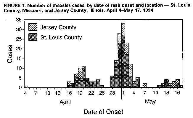 Persons using assistive technology might not be able to fully access information in this file. For assistance, please send e-mail to: mmwrq@cdc.gov. Type 508 Accommodation and the title of the report in the subject line of e-mail. Outbreak of Measles Among Christian Science Students -- Missouri and Illinois, 1994During April 4-May 17, 1994, the largest U.S. measles outbreak since 1992 occurred among students in two communities that do not routinely accept vaccination. This report summarizes the investigation of and control measures for this outbreak. The outbreak began in a 14-year-old Christian Science high school student who developed a rash on April 4, 2 weeks after skiing in Colorado where a measles outbreak was occurring. The student lived with her family in a community associated with a Christian Science college in Jersey County, Illinois, and commuted approximately 30 miles to a Christian Science boarding school (kindergarten through grade 12 {K-12}) in St. Louis County, Missouri. From April 16 through May 19, 141 persons with measles (age range: 1-24 years) were reported to the St. Louis County Health Department, and 49 persons with measles (age range: 4-25 years) were reported to the Jersey County Health Department (Figure_1). All cases met the measles clinical case definition (1) and were epidemiologically linked to the boarding school and/or college. Fourteen cases were serologically confirmed by detection of immunoglobulin M antibody. All cases occurred among persons not vaccinated before the outbreak. Eighteen prospective students from outside St. Louis County attended a carnival at the boarding school on April 16; eight developed measles after returning home (three to Maine, two to California, and one each to Missouri, New York, and Washington). Two cases of serologically confirmed measles occurred in persons outside the Christian Science communities. One case occurred in an unvaccinated 35-year-old physician who attended a tennis tournament on April 30 where students from the affected college competed. The other case occurred in a 9-month-old infant who visited a restaurant on April 30 where the college tennis team was eating. Control measures included offering measles vaccine to students in the affected communities and isolating persons with rashes and those considered susceptible to measles. On April 19, the boarding school and college began isolating persons with rashes in a separate building on each campus and placing 24-hour guards at campus entrances. Only persons with proof of immunity to measles were permitted to enter or leave the campuses. Isolation measures on both campuses remained in effect until 14 days after the appearance of rash in the last persons with measles for each school. Students who did not live on campus and had no proof of vaccination were voluntarily isolated in their homes, unless they were born before 1957 or could provide documentation of 1) previous physician-diagnosed measles, 2) laboratory evidence of measles immunity, 3) two doses of measles vaccine at least 1 month apart on or after their first birthday, or 4) one dose of measles vaccine on or after April 18, 1994. Measles vaccination was offered to Christian Science students and persons in the surrounding communities at special clinics offered by the public health departments in both Missouri and Illinois. A total of 149 Christian Science students (K-12) and their siblings were vaccinated in Missouri and 451 in Illinois. Of the 149 students at the boarding school who received measles-mumps-rubella vaccine (MMR) during outbreak control, 61 (41%) developed measles within 2 weeks after vaccination. Siblings of persons with measles who were enrolled in public schools in St. Louis County were voluntarily isolated at home. Active surveillance for persons with rashes was initiated in the county public schools on May 9 and consisted of a daily telephone call from the health department to the head nurse in each school district who monitored all student absentees for rash illness. A second dose of measles vaccine was administered to 675 students in vaccination clinics conducted in four public schools in St. Louis County and three public schools in the city of St. Louis where rash cases were detected. No outbreak-control vaccination was conducted in Illinois public schools because two doses of measles vaccine had been mandated for all K-12 schoolchildren since 1993, and compliance with this law was considered to be high. As of June 29, no additional measles cases had been reported among persons outside the Christian Science community in St. Louis County or elsewhere in Missouri or in Illinois. In response to the outbreak, St. Louis County will require two doses of measles vaccine for all schoolchildren by the start of the 1994-95 school year. Reported by: L Fisher, M Williams, L Feltmann, St. Louis County Dept of Health, Clayton; D Donnell, T Hicks, Missouri Dept of Health. T Macias, L Watson, Jersey County Health Dept, Jerseyville; C Jennings, Illinois Dept of Public Health. National Immunization Program, CDC. Editorial NoteEditorial Note: The magnitude of this outbreak illustrates the potential challenges that groups that do not routinely accept vaccination present for eliminating indigenous measles in the United States by 1996 (2,3). Communities that do not accept vaccination are at risk for recurring outbreaks and may provide foci of infection that can result in further transmission. Measles outbreaks had occurred at both the school and college in this report during 1978, 1980, 1985, and 1989; three students died from measles-related complications in the 1985 outbreak (2). From January 1 through June 10, 1994, outbreaks among persons who do not accept vaccination in Illinois, Missouri, Nevada, and Utah accounted for approximately 50% of all reported measles cases (excluding U.S. territories). Although Christian Science doctrine does not forbid medical care, many Christian Science parents claim